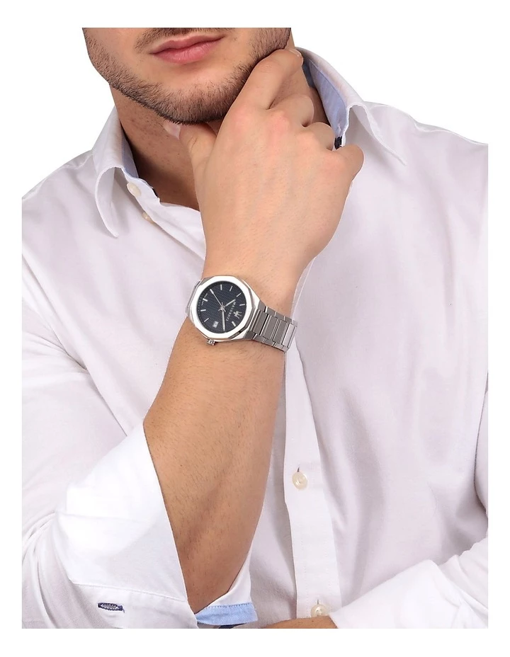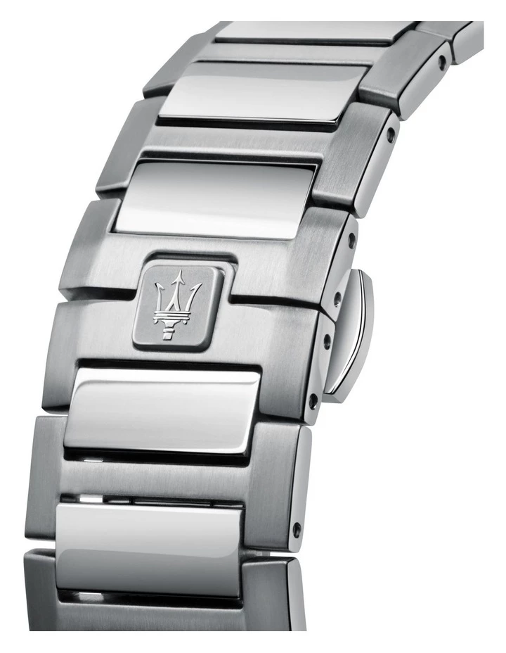 Presenting the Maserati Stile Blue Watch. Welcome to the Maserati Stile Collection: watches that take up the mechanics, construction and stylistic codes of the iconic sporting watchmaking timepieces. The decisive lines, the distinctive decagonal bezel and theslim case are combined with details that strongly identify the sportingworld such as: pump pushers, screw-down crown, multi-level dial, appliedluminescent indexes, luminescent hands and a buckle with a personalisedbutterfly clasp featuring the applied Trident.- Materials: Stainless steel