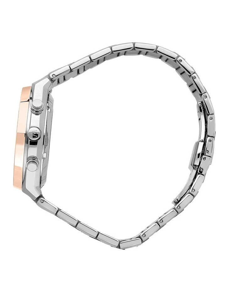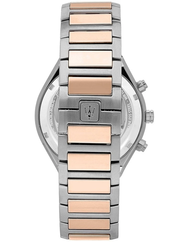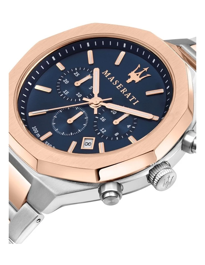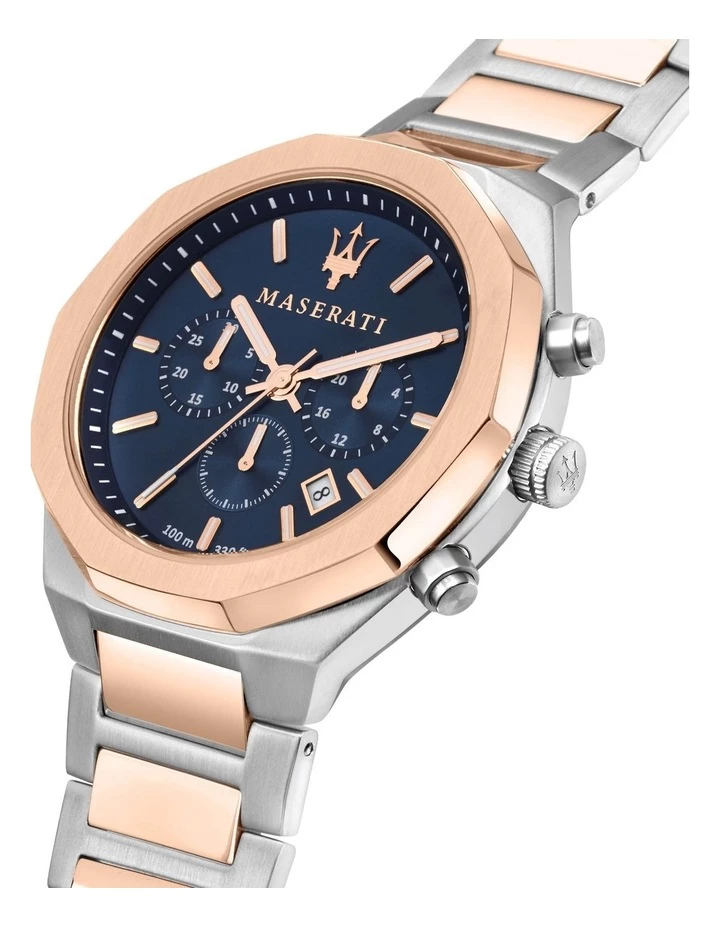 Presenting the Maserati Stile Two Tone Chronograph Watch. Welcome to the Maserati Stile Collection: watches that take up the mechanics, construction and stylistic codes of the iconic sporting watchmaking timepieces. The decisive lines, the distinctive decagonal bezel and theslim case are combined with details that strongly identify the sportingworld such as: pump pushers, screw-down crown, multi-level dial, appliedluminescent indexes, luminescent hands and a buckle with a personalisedbutterfly clasp featuring the applied Trident.