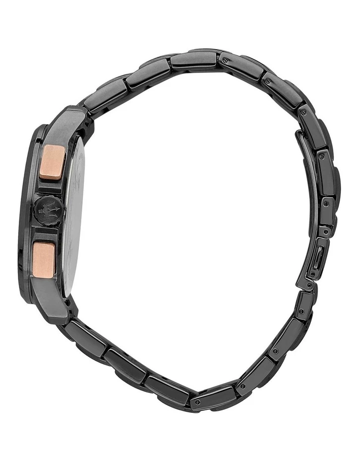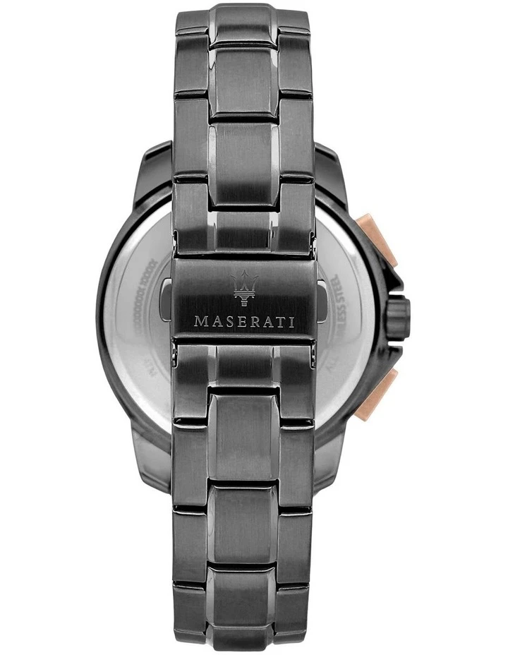Cutting-edge technical solutions are behind the watches from Maserati Successo Solar collection, creating technical masterpieces such as this Maserati Successo Solar Gunmetal Chronograph Watch. Watches powered by solar cells that capture natural andartificial light and transform it into energy for the movement (chronoand 3H). Their autonomy, when fully wound, is approximately four months. A sporty look with a 45mm case for the men’s version, whichfeatures dials with luminescent indexes and hands, contrasting finishesand a power reserve indicator.