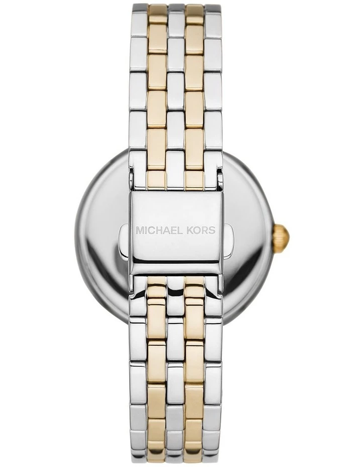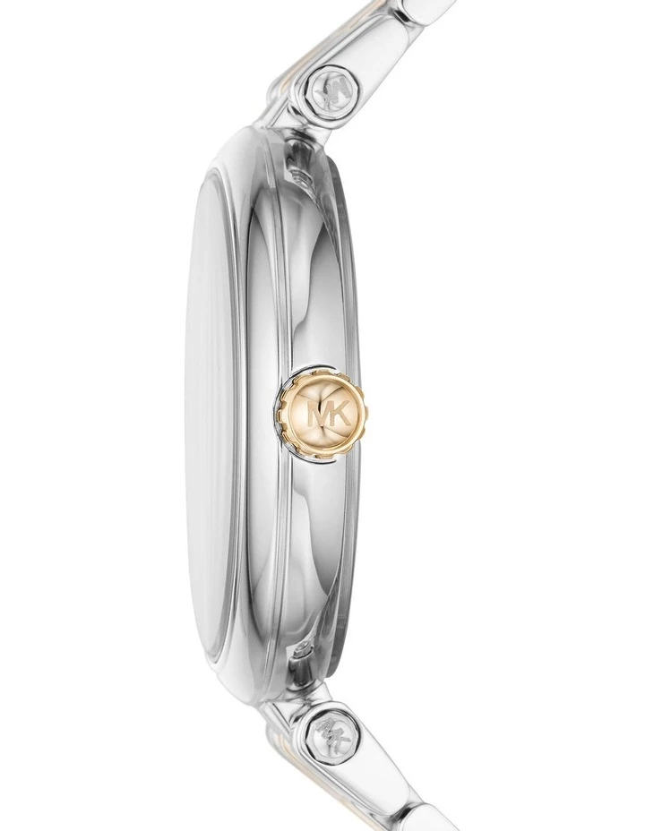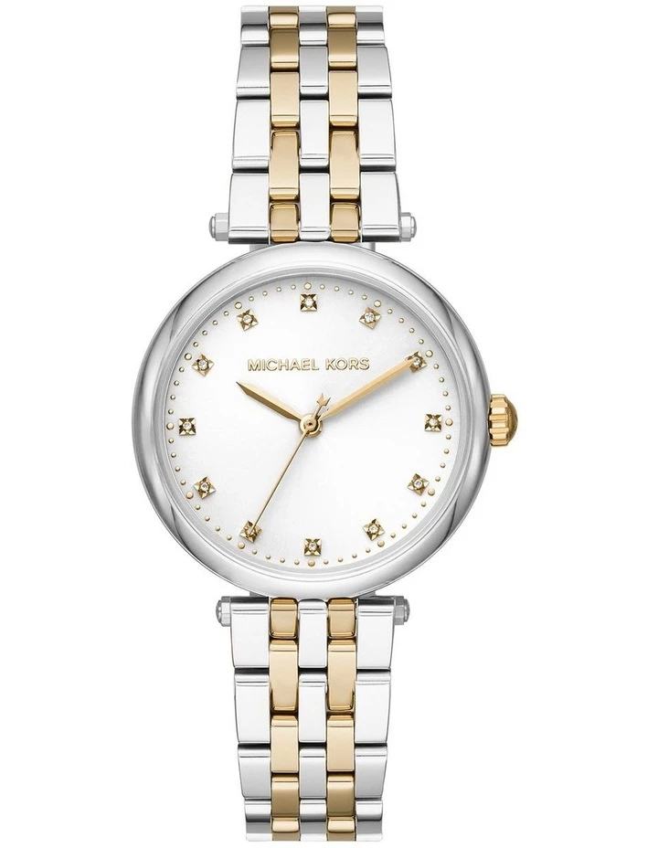 The beauty of perfect timing is not lost on Diamond Darci by Michael Kors. A classic analogue watch, it has the sophistication and charm of a proper lady. The 34mm watch features a white sunray dial with 12 diamond indexes, three-hand movement and stainless steel bracelet with gold-tone centre links.