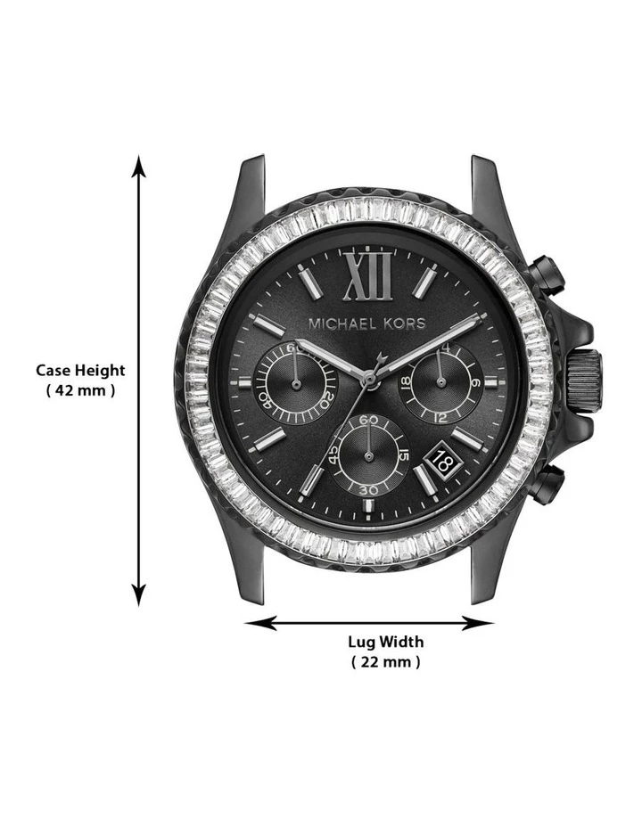 MK6974 Michael Kors’ 42mm Everest watch features a black sunray dial, gunmetal IP case with clear baguette topring, chronograph movement and gunmetal IP bracelet with pav center links.