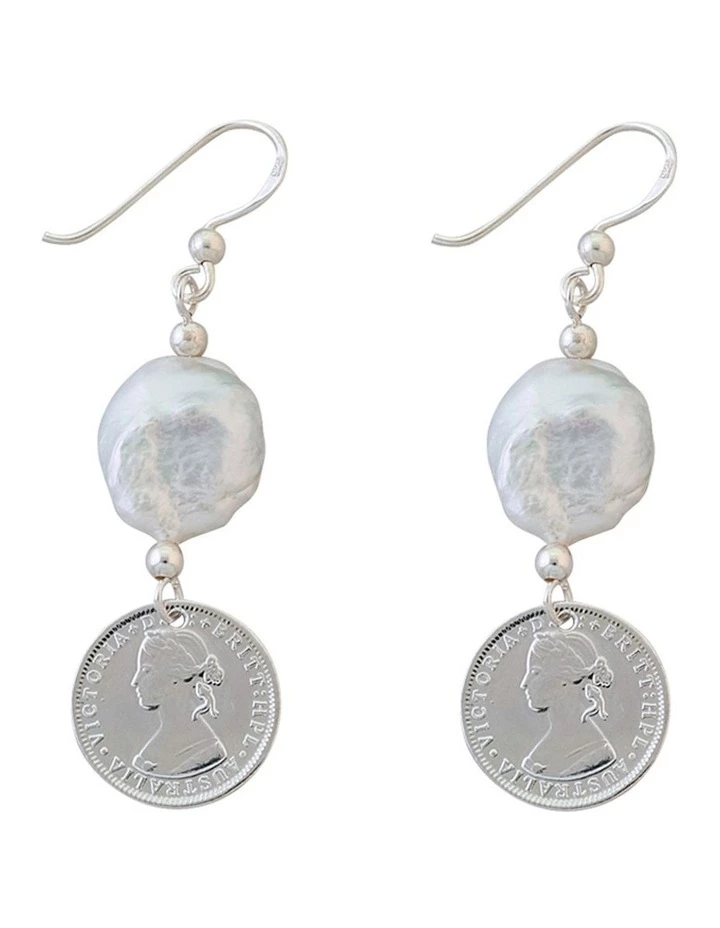 This Von Treskow sterling silver threepence token earrings is detailed with keshi pearls. Keshi pearls are known for their irregular shapes. Each pearl contains individual bumps and curves, making every piece unique. The addition of the heritage feel of the threepence sized token coin creates a timeless style.