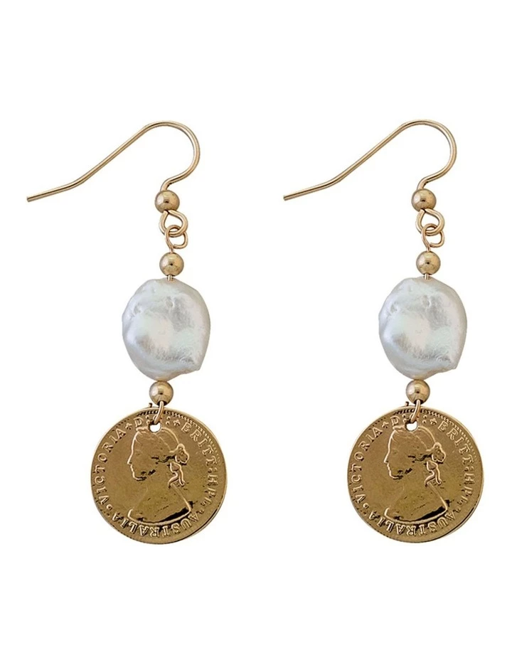 This Von Treskowyellow goldthreepence token earrings is detailed with keshi pearls. Keshi pearls are known for their irregular shapes. Each pearl contains individual bumps and curves, making every piece unique. The addition of the heritage feel of the threepence sized token coin creates a timeless style.