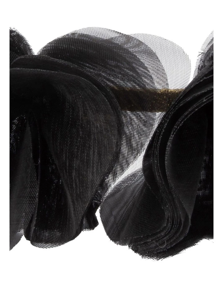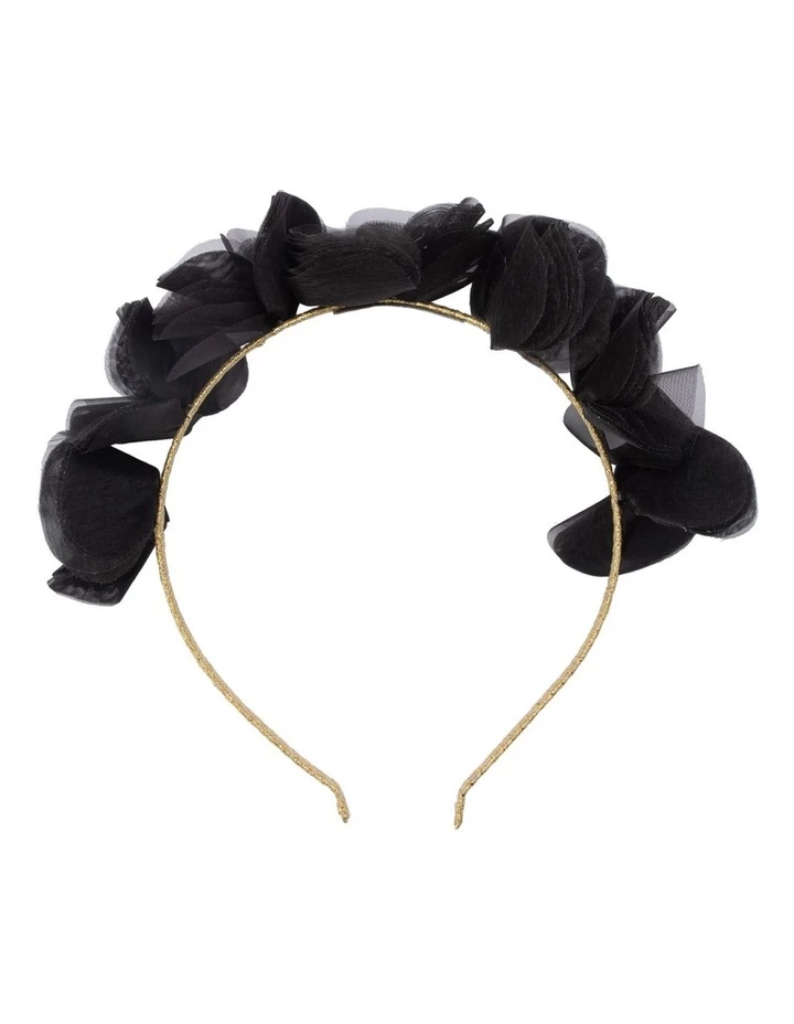 The LIDIA Organza Ruffle Headband features petal like layers of laser cut organza arranged on a Gold ribbon wrapped headband for a soft and feminine look.