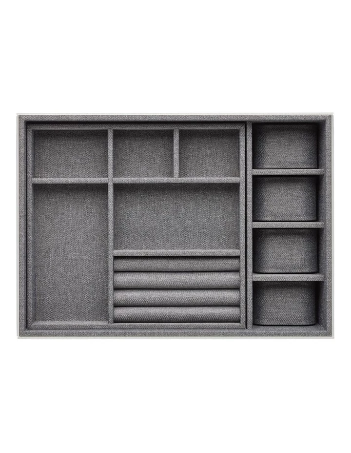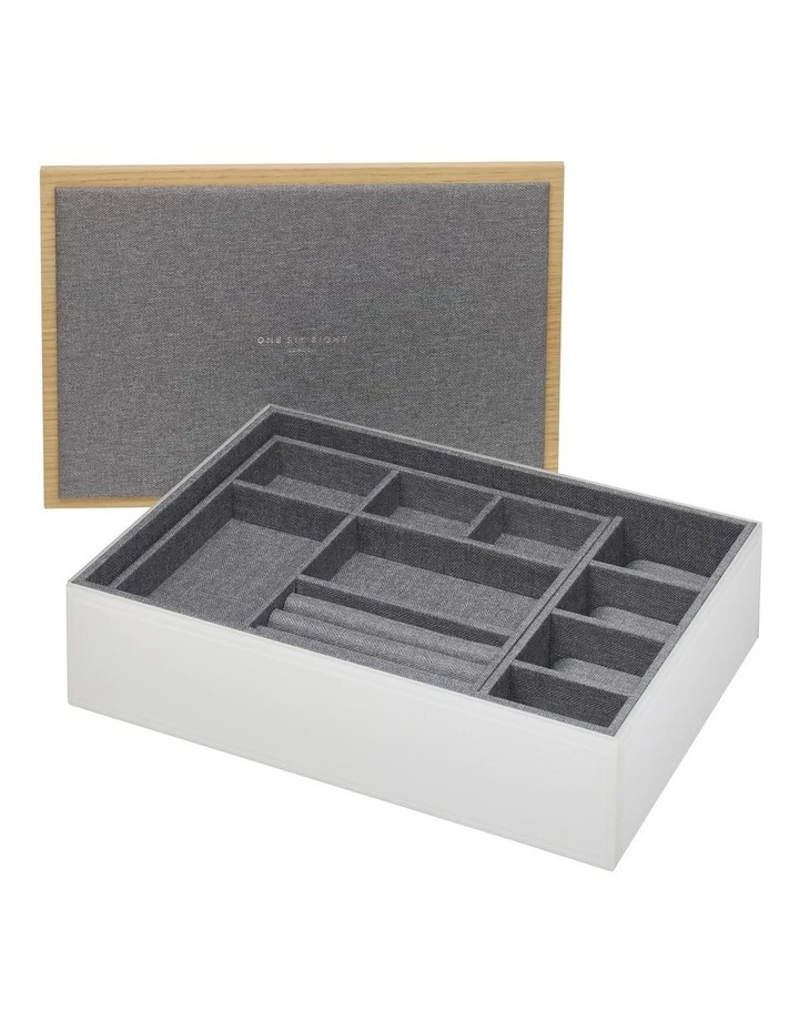 Eva – for the lady that loves all that glitters. These stunning pure white glass boxes are teamed with a Natural solid wood lift off lids. They are lined with a sophisticated, pale grey herringbone tweed, perfect for keeping your jewellery and precious items scratch free and safe. These boxes are glamorous but simplistic offering a range of storage options.