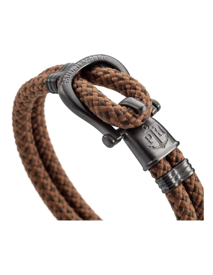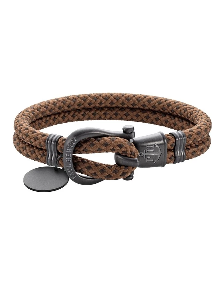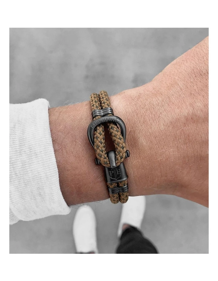 Maritime. Robust. Authentic. Our new Phinity collection for men combines nautical symbolism in a material mix thats both sporty and elegant. The grey shackle made of stainless steel serves as a unique locking point for our bracelet, connecting sturdy sailing ropes and representing cohesion and strength. With your camel-olive Phinity bracelet, youre carrying a very loyal companion on your wrist whether out on the high seas or in the urban jungle.