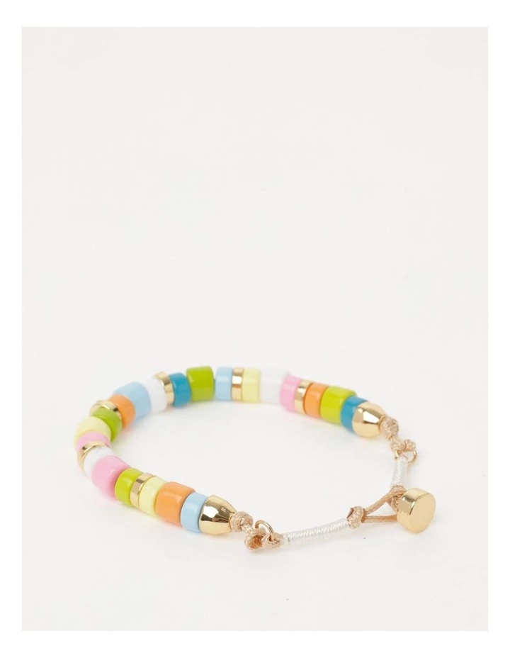 Elevate your look with a beaded bracelet. This bracelet has a gold toned closure and is decorated with vibrant pastel beads. Perfect for adding a pop of colour to your outfits!