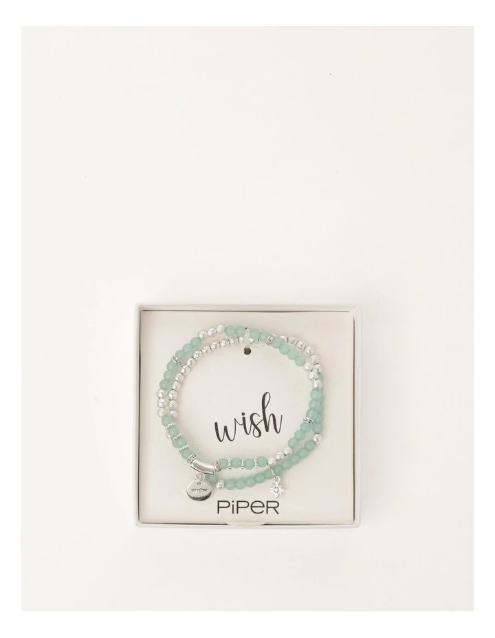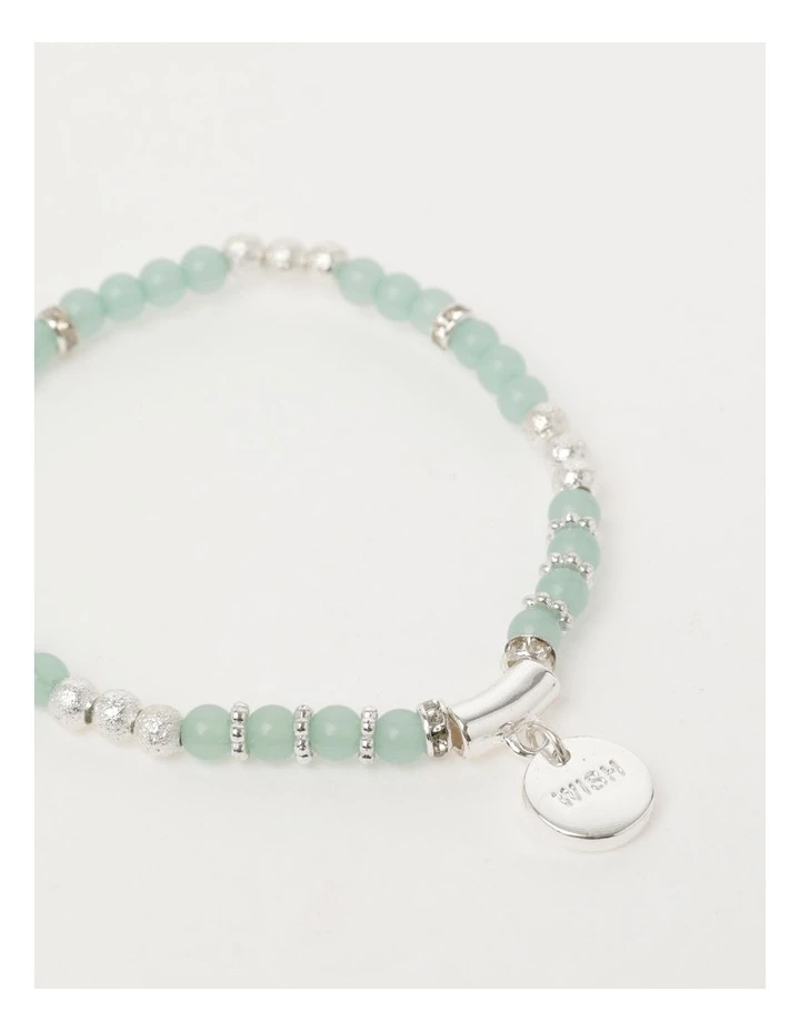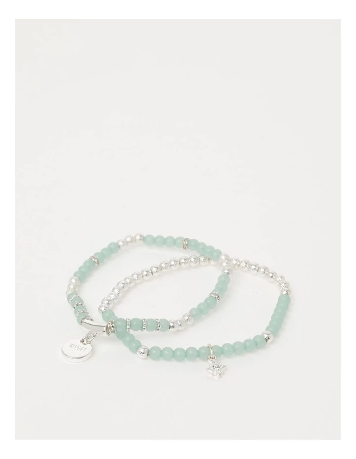 Elevate your look with a bracelet set. This set features two mint and silver beaded bracelets that are adorned with graceful charms and have a stretch design for easy wear. Mix and match to your hearts content!