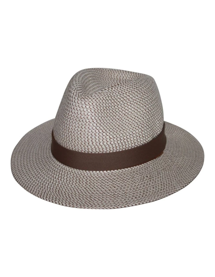 Short brimmed fedora in stylish beige and white polybraid. Suits both men and women. Super travel friendly as its foldable and crushable.