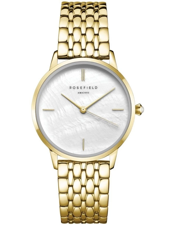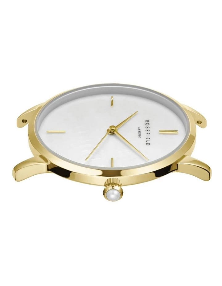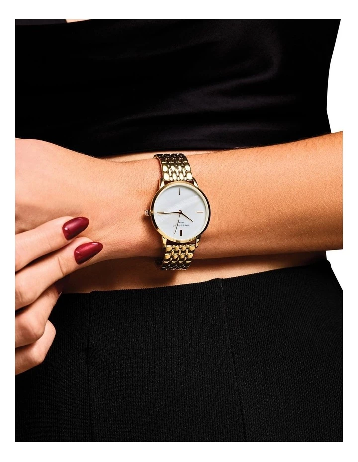 A contemporary classic – The Pearl Edit delights with natural elements of mother-of-pearl in the dial and crown, set in an immaculate yellow gold plated case, paired with a luxurious seven piece stainless steel bracelet.