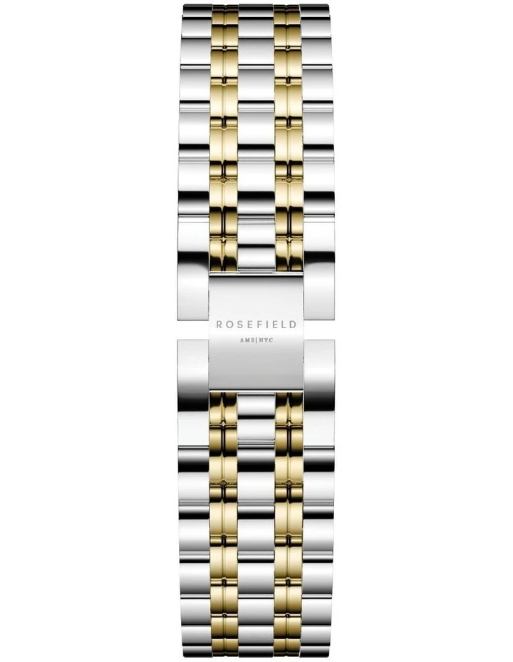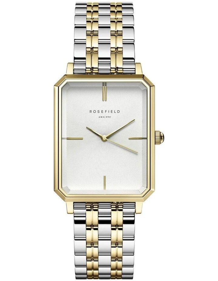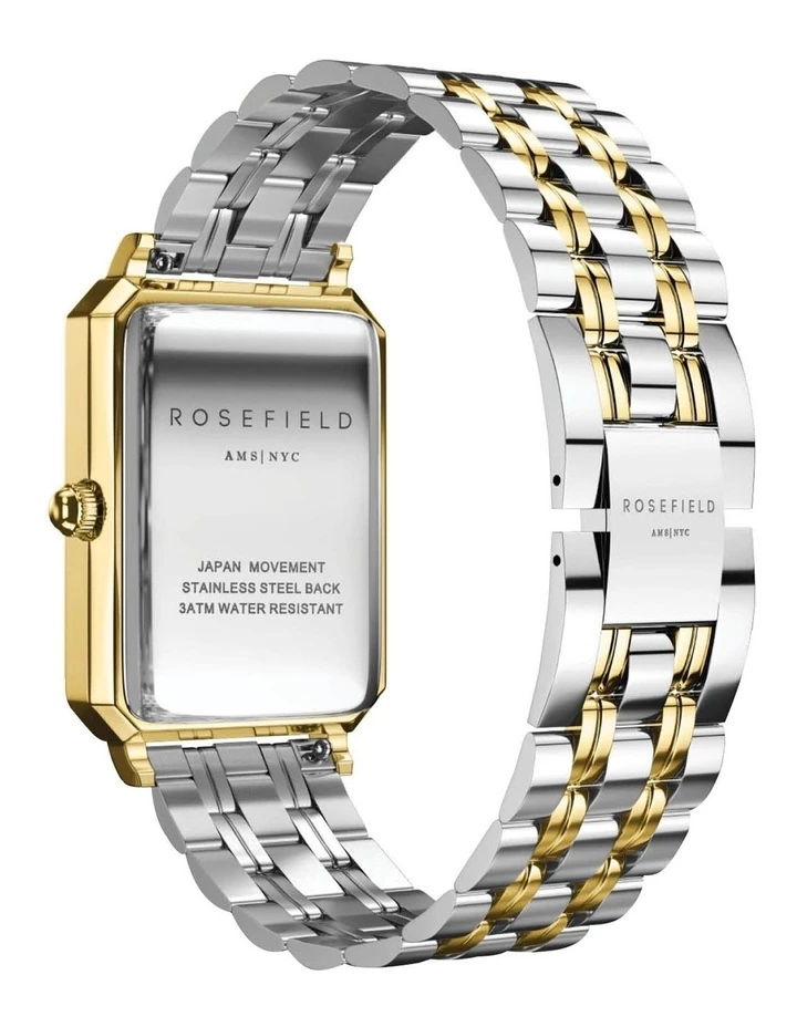 The Rosefield Elles features the new rectangular case in gold tone with white dial and 2 tone bracelet strap