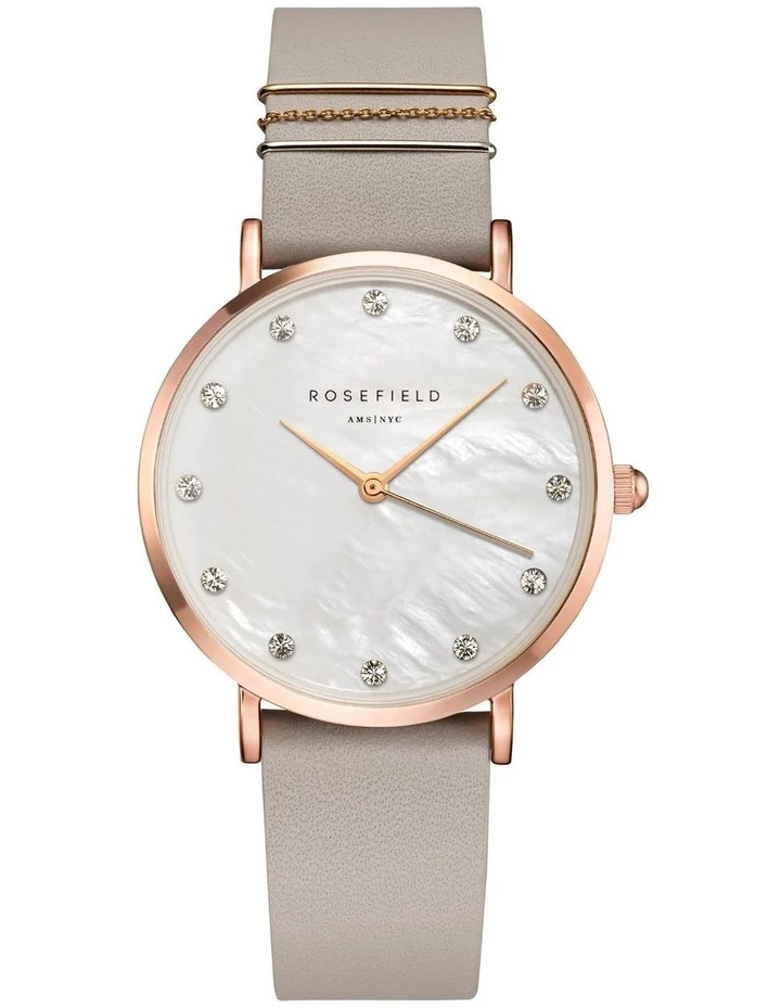 The Rosefield West Village features a cool grey nubuck leather strap with a 33mm rose tone case.