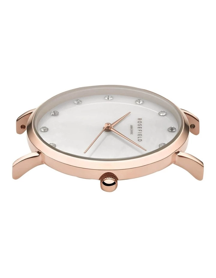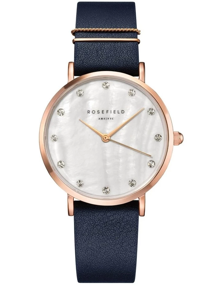 The Rosefield West Village features a navy nubuck leather strap with a 33mm rose tone case.