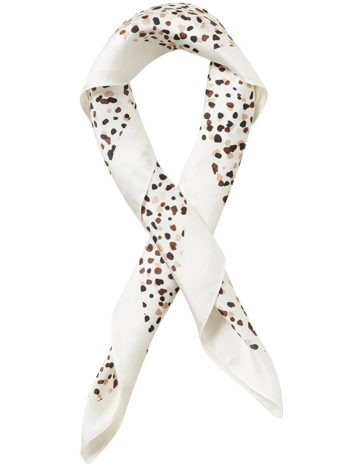 Dotted with an abstract spot pattern, this square scarf brings a touch of elegance to any outfit. The material has a sheen to it for a touch of shine, and features a neat border.