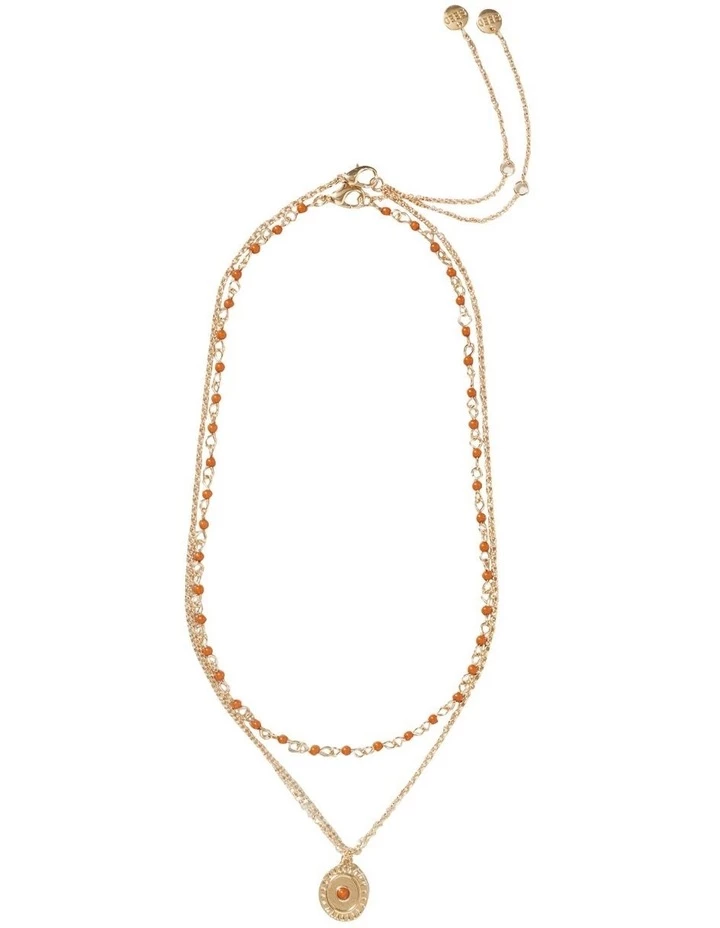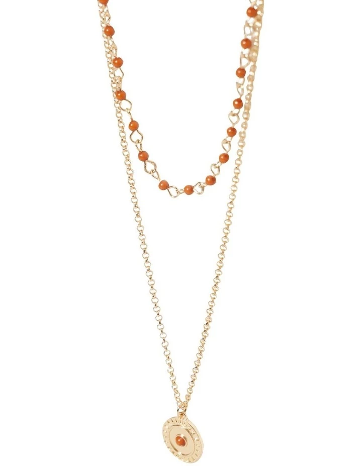 Add a hint of colour to any look with this layered necklace. Red beads dot the smaller of the chains, while a simple pendant with a circle design hangs from the other. The necklace has an extra layer of chain at the clasp for an adjustable fit.