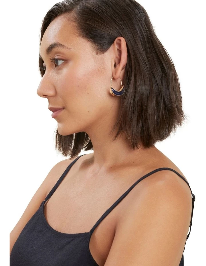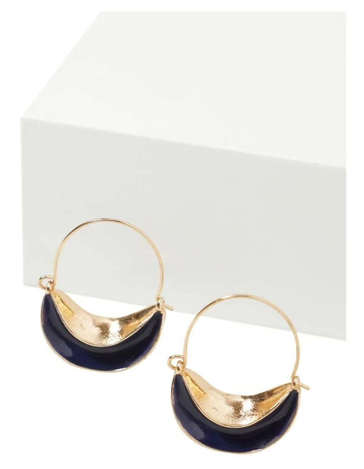 These swing style earrings have a fluid shape, filled with bright enamel. The earrings are a hoop design, with a latch closure and a shiny finish.