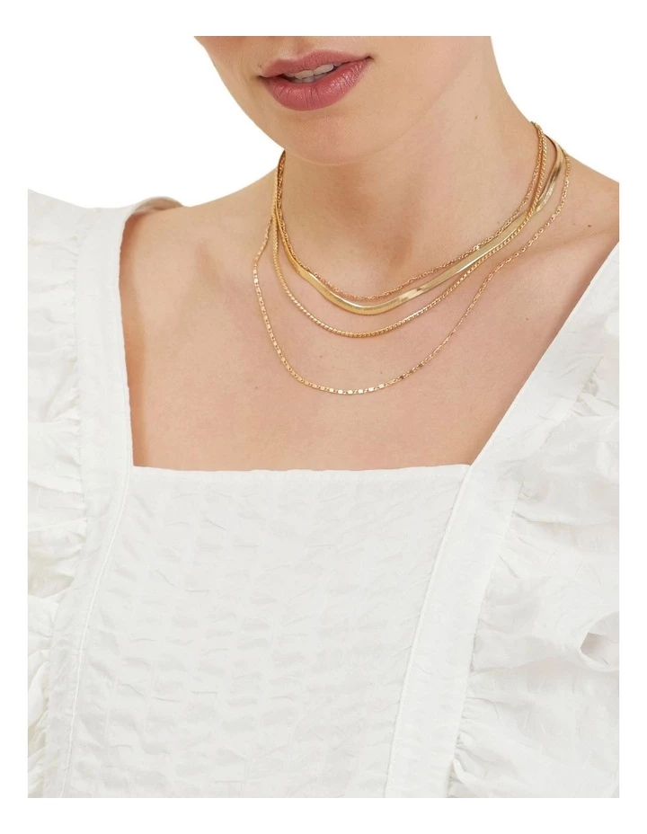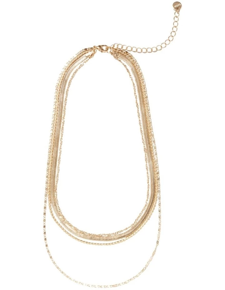 Elevate any outfit with this layered necklace, featuring varied lengths and textures for effortless styling. The four chains have different shapes and style, and hang together with a latch fastening with an extra length of chain for an adjustable fit.
