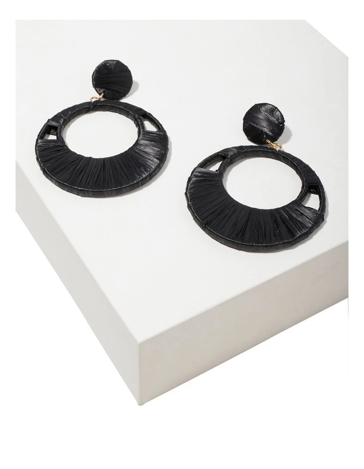 Introduce a summery feel to any outfit with these statement earrings. Textured raffia is woven around the circle stud and oversized hoop, and the abstract style earrings have a stud backing.