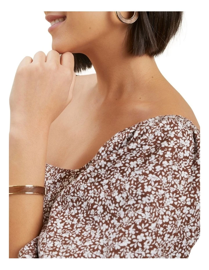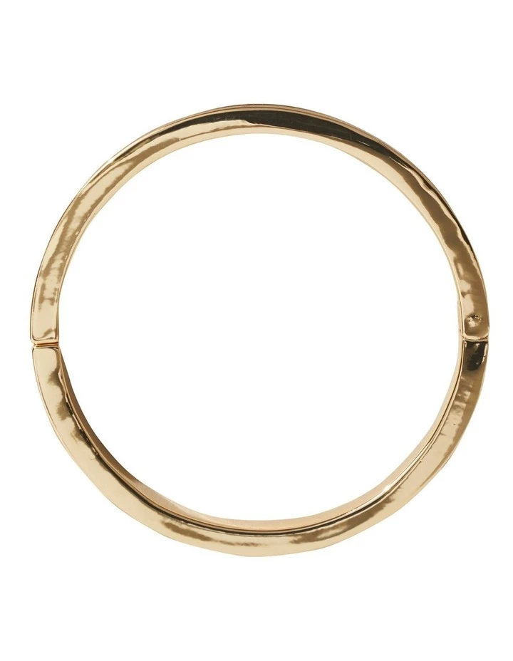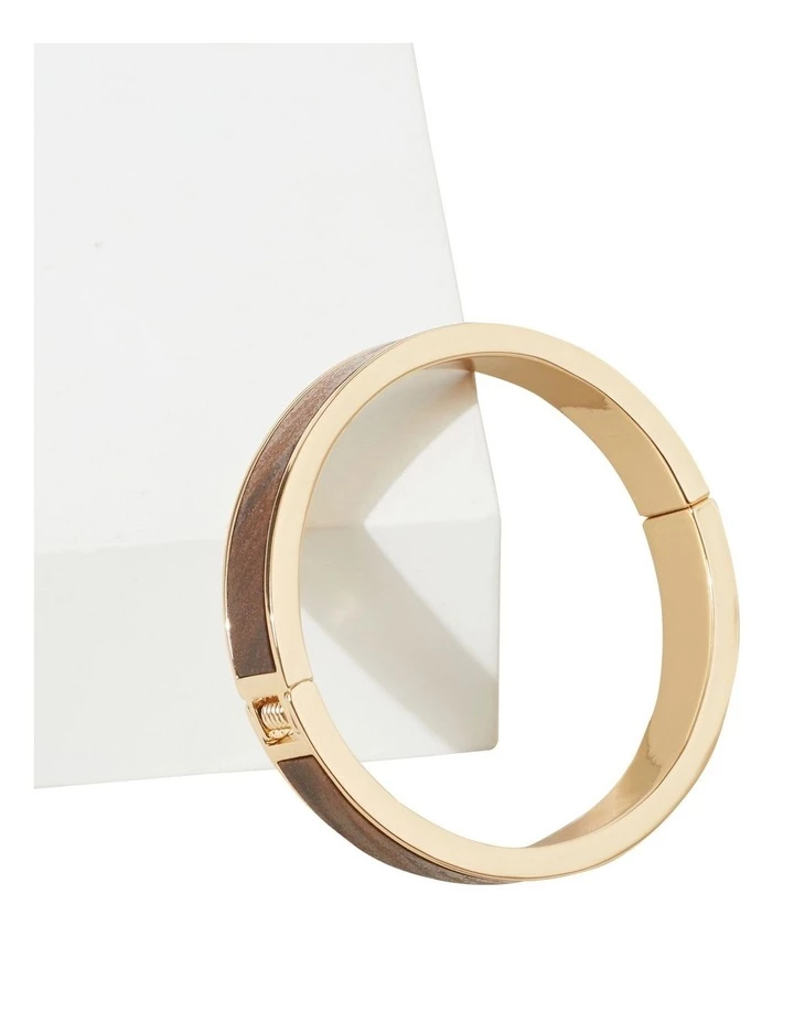 This golden bangle is designed with a smooth wooden inlay, in contrast to the bright metal. The bangle has a sleek shape, and can be worn on its own, or stacked with other bracelets for a statement look.