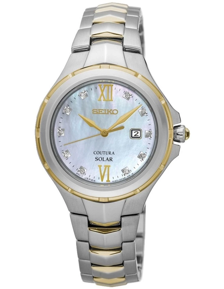 The Seiko SUT308P is a ladies dress watch from the Seiko Coutura collection. This silver and gold two tone watch is complete with a mother of pearl dial and 10 diamond markers. Featuring the Solar calibre V147, it is powered by any light source and has approximately 6 months power reserve at full charge. The Coutura collection boasts everyday perfection.