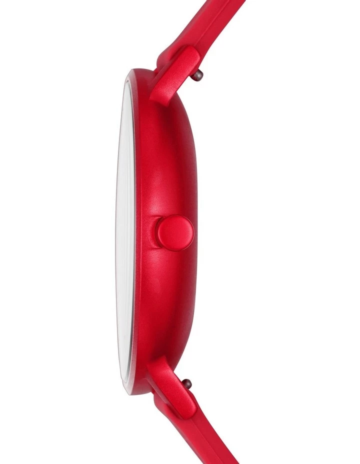 This Skagen analog watch is the definition of everyday elegance. It features a red matte dial with arabic numeral indexes, two-hand movement in a slim case and silicone strap. Its the perfect watch to glam up an everyday look, or to complete a sophisticated ensemble.