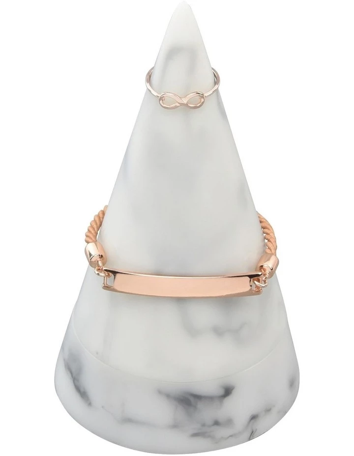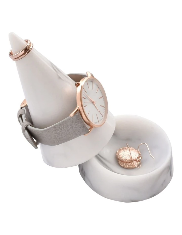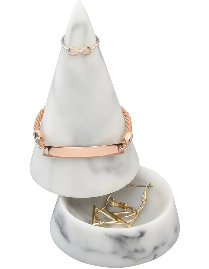 Stackers Jewellery Peaks are an innovative way to hold your everyday pieces of jewellery. Available in three colours these Large Peaks have a hidden compartment for your extra rings. The White Marble Cone Jewellery Peak is made with Polyresin Size: 75x75x125mm