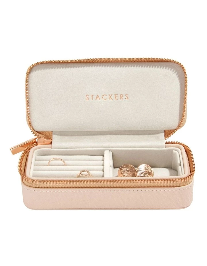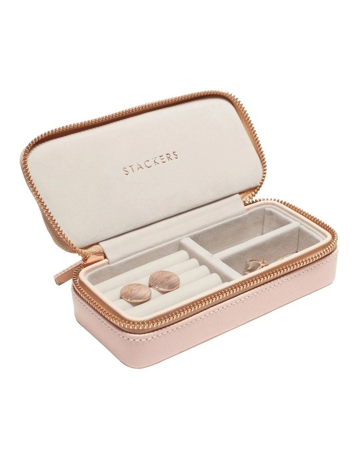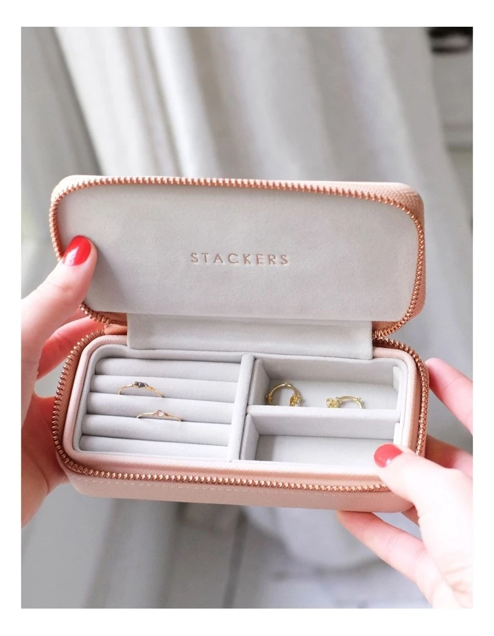 Keep your sparkle with you. With a luxurious grey velvet lining and blush exterior, this is a must for your travels. Various internal compartments enable you to carry and protect your favourite pieces. The Blush Medium Travel Jewellery Box is made with Vegan Leather & Velvet When you?re home it will sit neatly inside your Watch/Accessories Layer. Size: 160x70x42mm