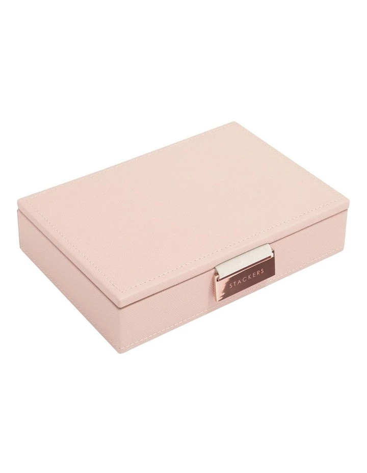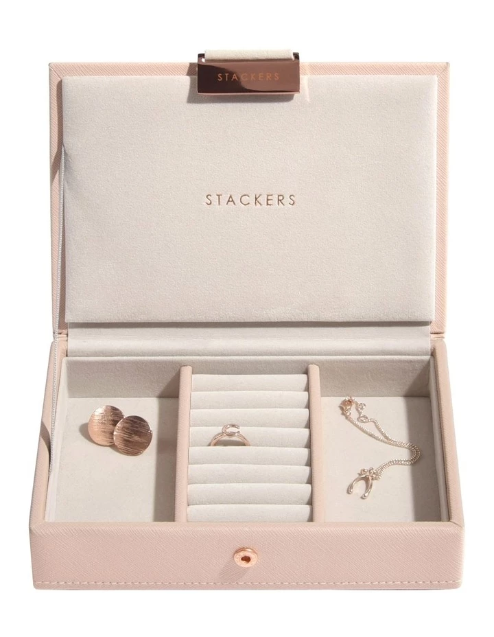 Stackers jewellery boxes are designed so you can create your own by choosing which layers and accessories best suit your unique collection. The Blush Mini Jewellery Box Lid is made with Vegan Leather & Velvet The mini jewellery box lid is ideal for smaller jewellery collections. With compartments for small rings, earrings and bracelets, it?s perfect for your everyday jewellery. Size: 180x125x40mm