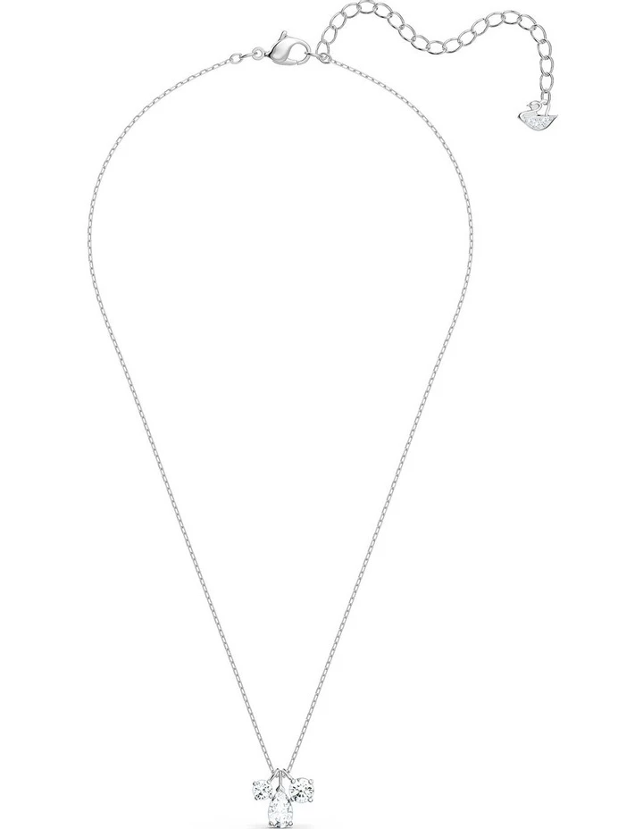 This pendant by Swarovski displays artful craftsmanship. It is adorned with three shimmering white stones: The central, drop-shaped element is complemented beautifully by two smaller, round stones. Delicate facets create a refined yet simple look, perfect for embellishing everyday outfits. The pendant is complemented by a matching chain and is a great match with similar pieces of jewelry.