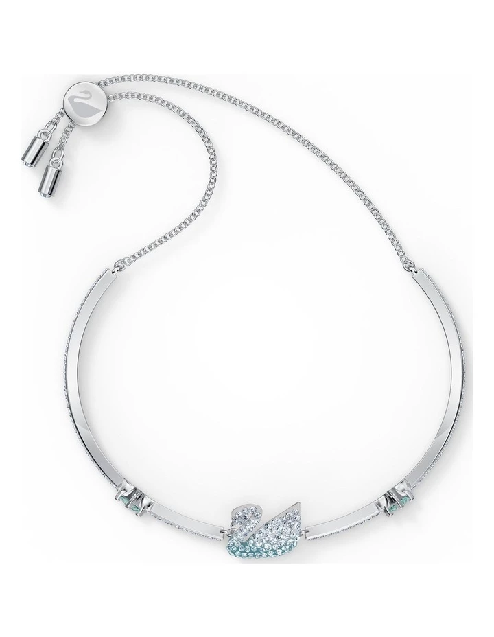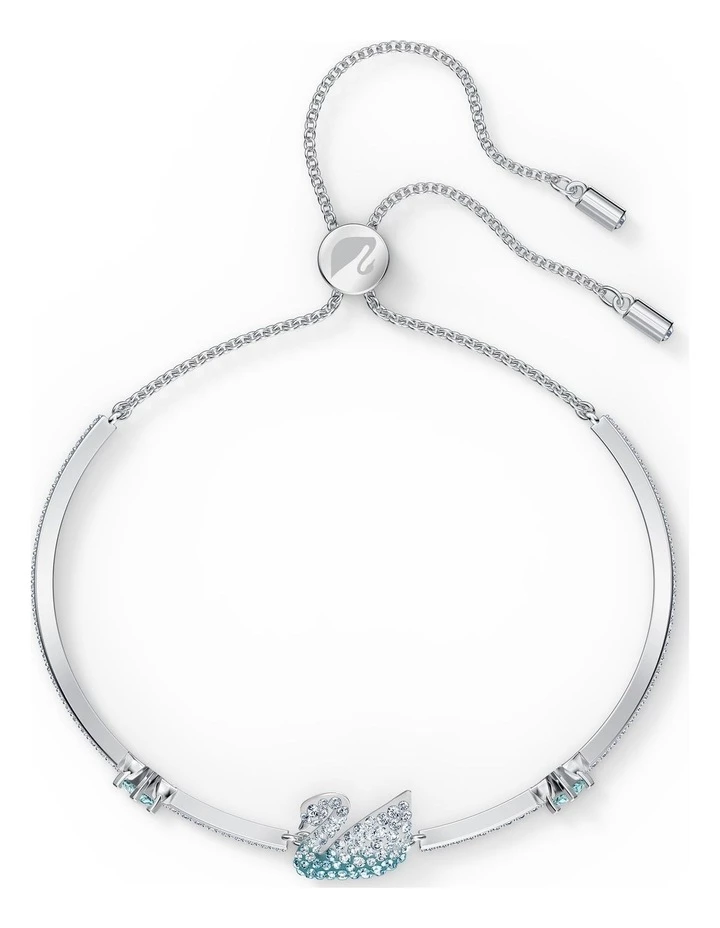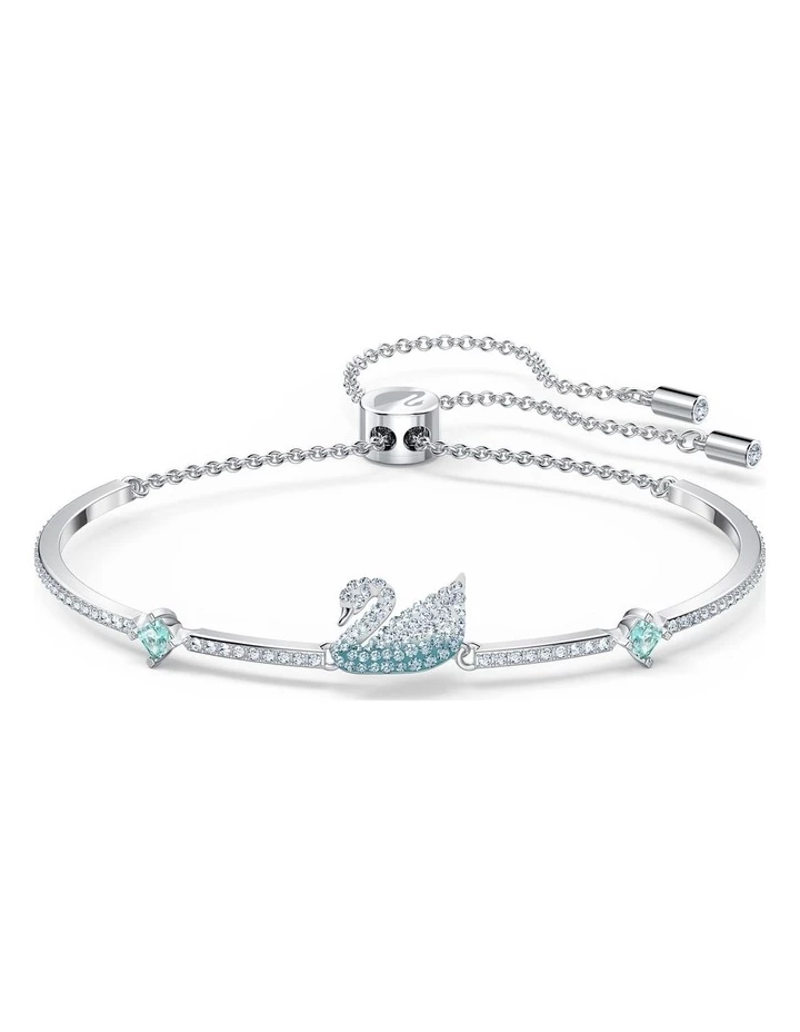 This Swarovski bangle offers timeless beauty in a new splendor. It features a noble swan, picked out beautifully in sparkling white, green, and soft blue crystals. Two square blue stones glitter to either side of the swan, accentuating its refined design. The bangle closes with a sliding closure for easy size adjustments. Adding a lovely touch of cool romance to many looks, this bangle is easy to pair with other pieces of jewelry, and an amazing gift giving idea.