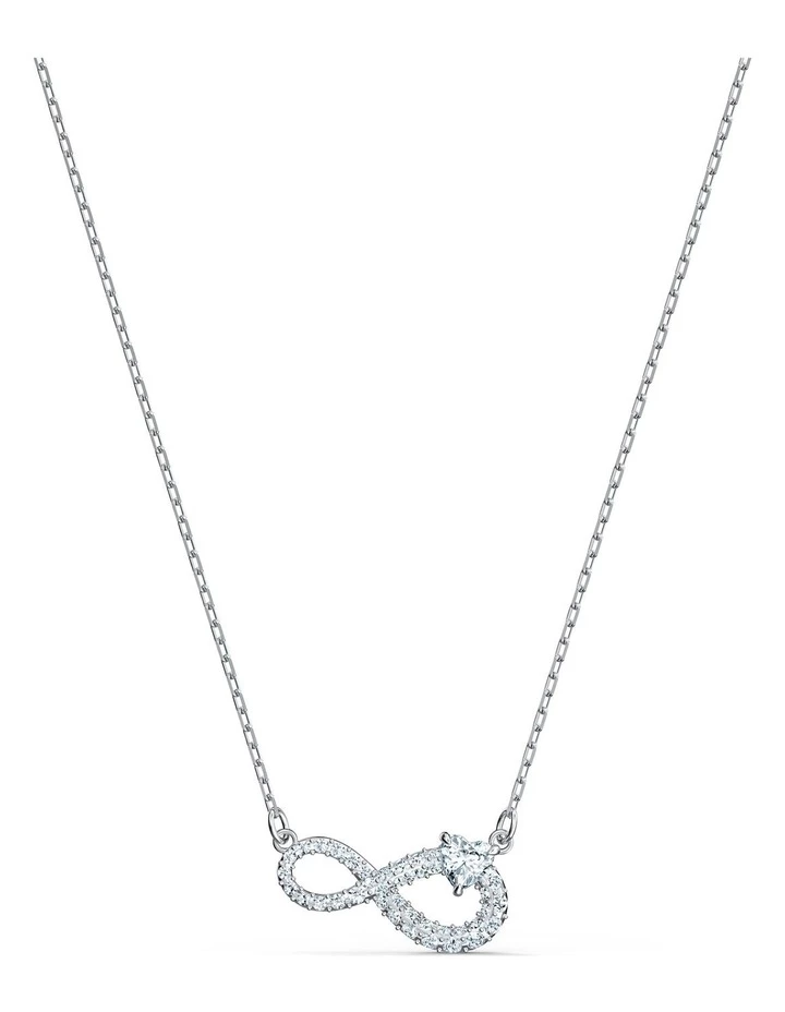 This Swarovski necklace showcases an infinity symbol on a rhodium-plated chain and is the perfect expression of eternal love. A single white stone in the shape of a heart is set onto the infinity element, adding a romantic touch to the design. The perfect gift for a loved one.