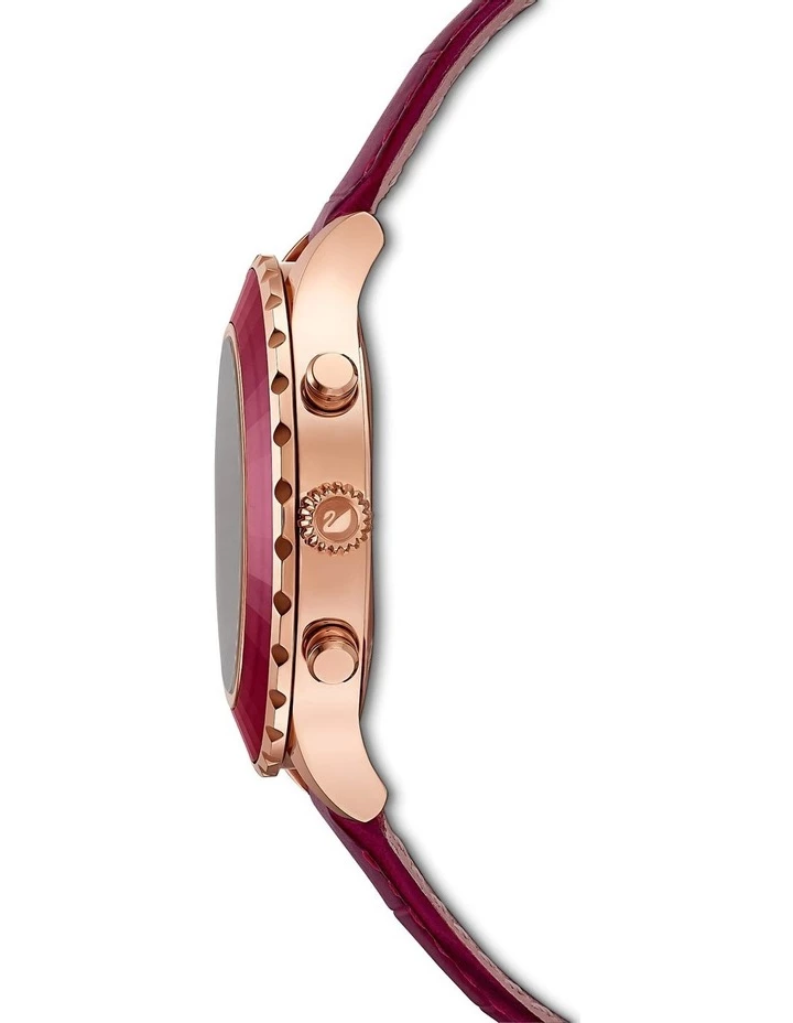 This watch by Swarovski expertly combines functionality and modern design. A red faceted crystal ring adorns the bezel, complementing the rose-gold tone PVD coated case and index markers. The watch features a chronograph mechanism and is fitted with a crocodile-embossed red genuine leather strap. A striking example of craftsmanship and a sporty addition to your look.