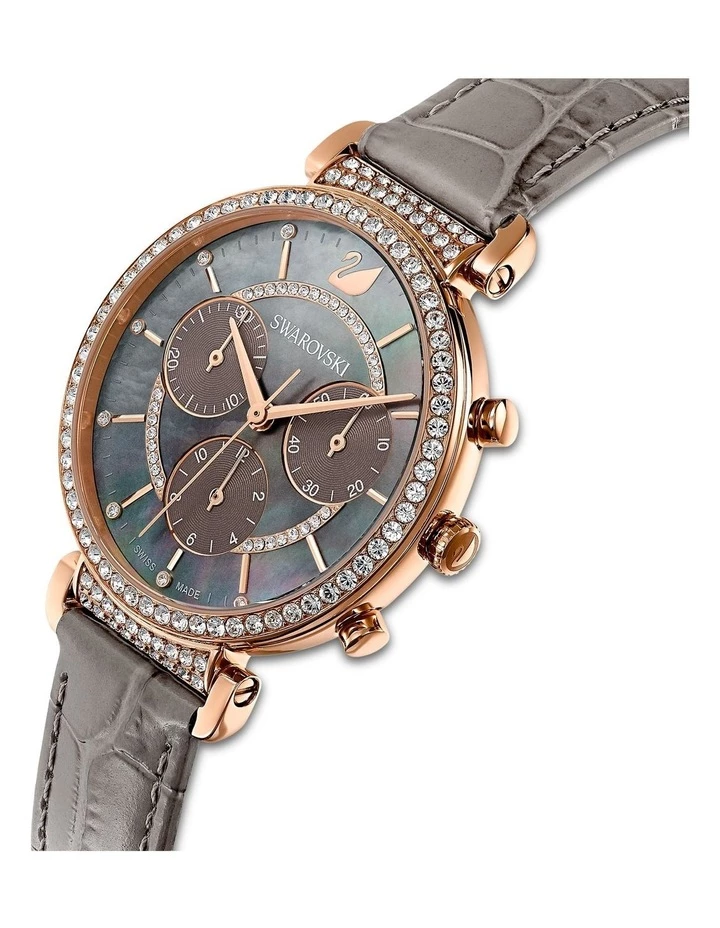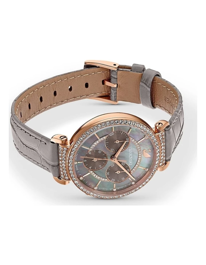 A perfect blend of modernity and tradition, this luxurious chronograph watch by Swarovski will elevate any outfit. Featuring a contemporary rose-gold tone PVD coated stainless steel case and taupe mother-of-pearl dial, the opulent design sparkles with 100 clear crystals, set in rich pav. The subtly-integrated chronograph movement, trio of dial counters and genuine leather strap in taupe, with a crocodile pattern and quick-release mechanism, add understated flair. A timeless classic to wear anywhere, it complements anything from jeans and a t-shirt to a ball gown. Made in Switzerland, it is water resistant to 50m.