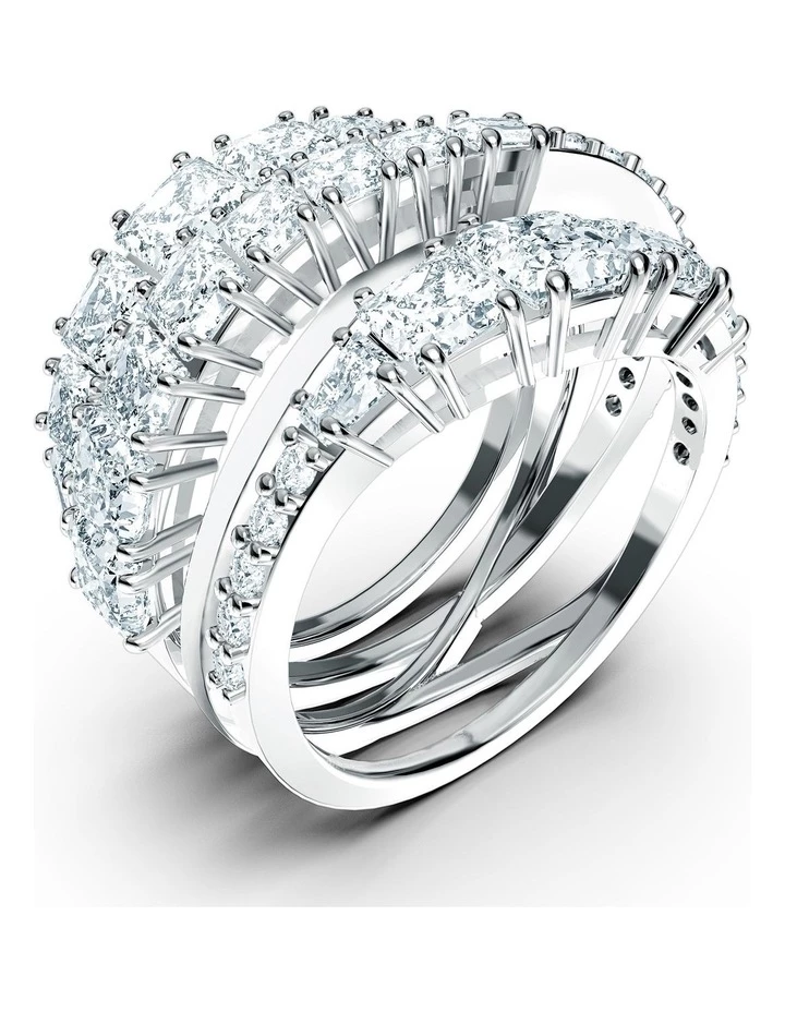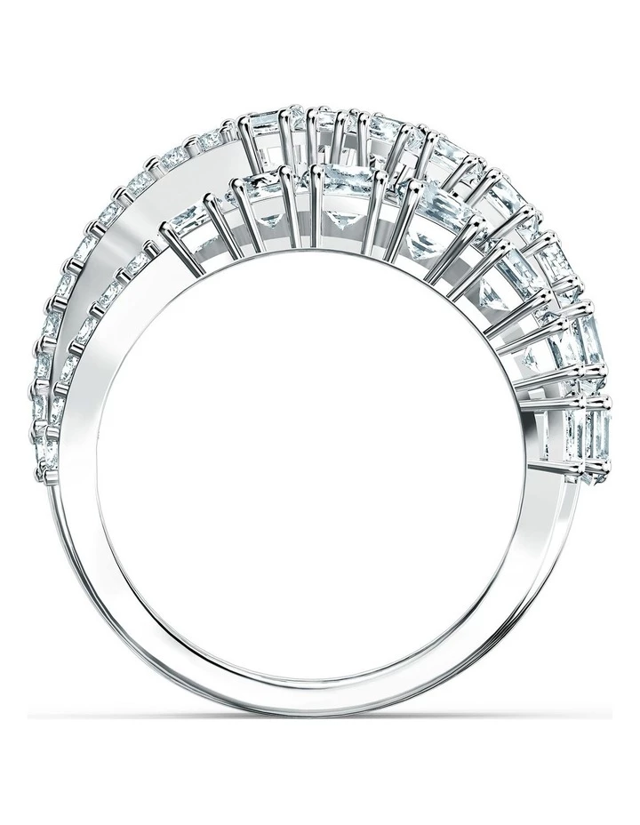 Intricate and opulent, this marvelous Swarovski ring reinterprets the spiral trend magnificently. Gently curving lines of white stones of various sizes in round, square, and tapered baguette-shapes sparkle brilliantly in many facets. Complemented by a shimmering finish, the elegant design makes it perfect for dressing up your style, adding a radiant touch of glamor to your look.