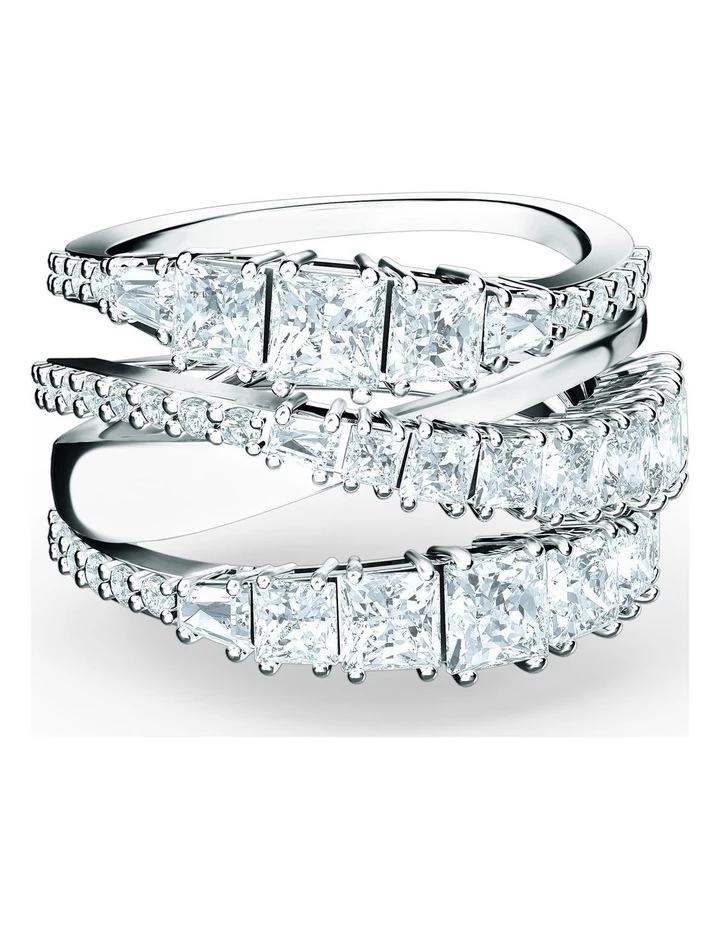 Intricate and opulent, this marvelous Swarovski ring reinterprets the spiral trend magnificently. Gently curving lines of white stones of various sizes in round, square, and tapered baguette-shapes sparkle brilliantly in many facets. Complemented by a shimmering finish, the elegant design makes it perfect for dressing up your style, adding a radiant touch of glamor to your look.