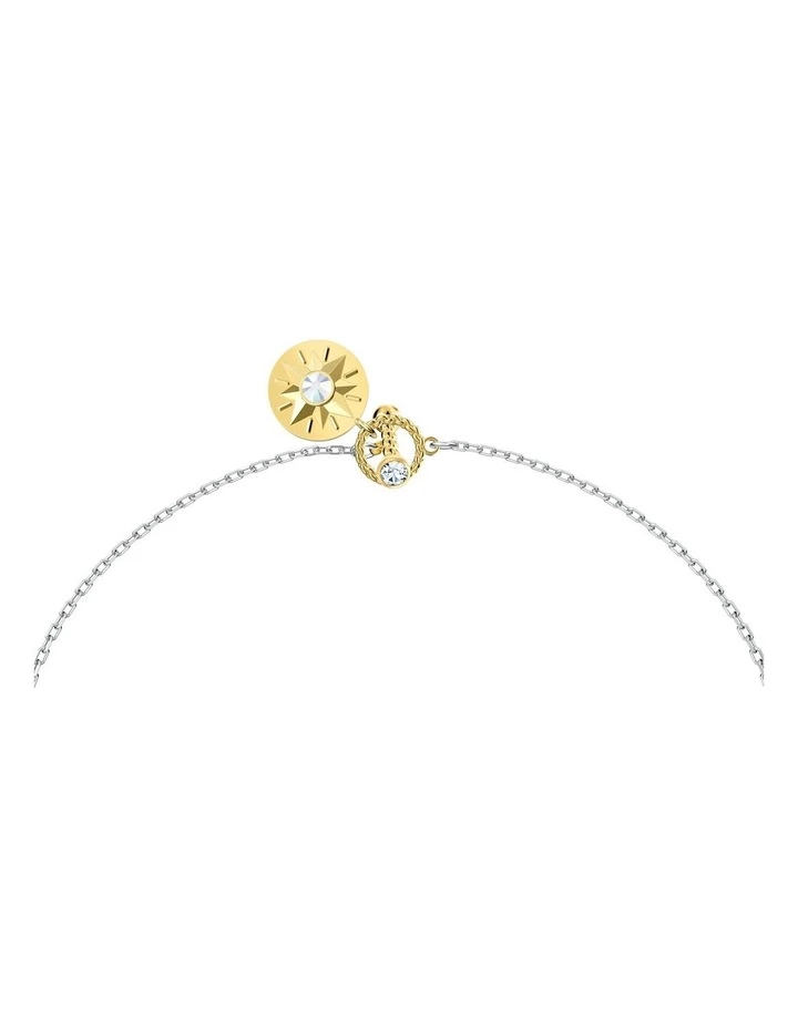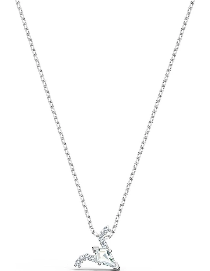This pendant by Swarovski is inspired by the sign of Aries. Representing boldness and energy, the stylized ram is traced in sparkling clear crystal pavé centered around a white stone, evoking the stars of the zodiac. The complementary chain is fastened with a t-bar closure that is adorned by a shimmering coin displaying a sun on one side, with elemental symbols on the flip side. Wear the closure at the back or the front, either with the zodiac motif or without it to create many different looks: ideal to personalize your style, especially when layered with matching pieces of jewelry. A perfect gift for those born under Aries.
