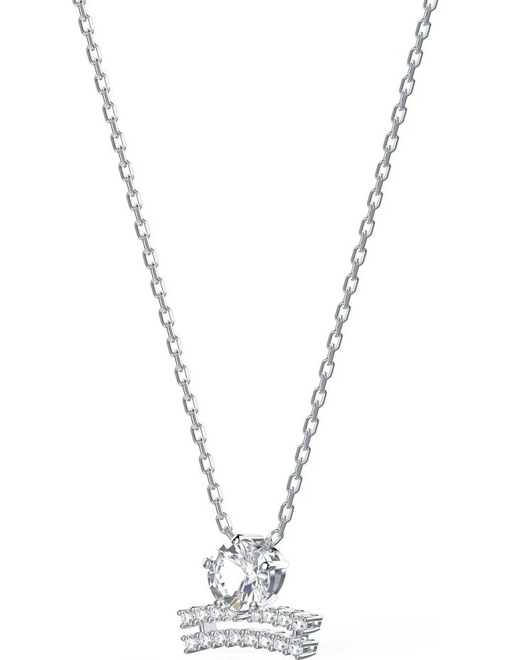 This pendant by Swarovski is inspired by the sign of Libra. Representing harmony and balance, the carefully balanced lines of the sign are traced in sparkling clear crystal pavé and centered around a white stone, evoking the stars of the zodiac. The complementary chain is fastened with a t-bar closure that is adorned by a shimmering coin displaying a sun on one side, with elemental symbols on the flip side. Wear the closure at the back or the front, either with the zodiac motif or without it to create many different looks: ideal to personalize your style, especially when layered with matching pieces of jewelry. A perfect gift for those born under Libra.