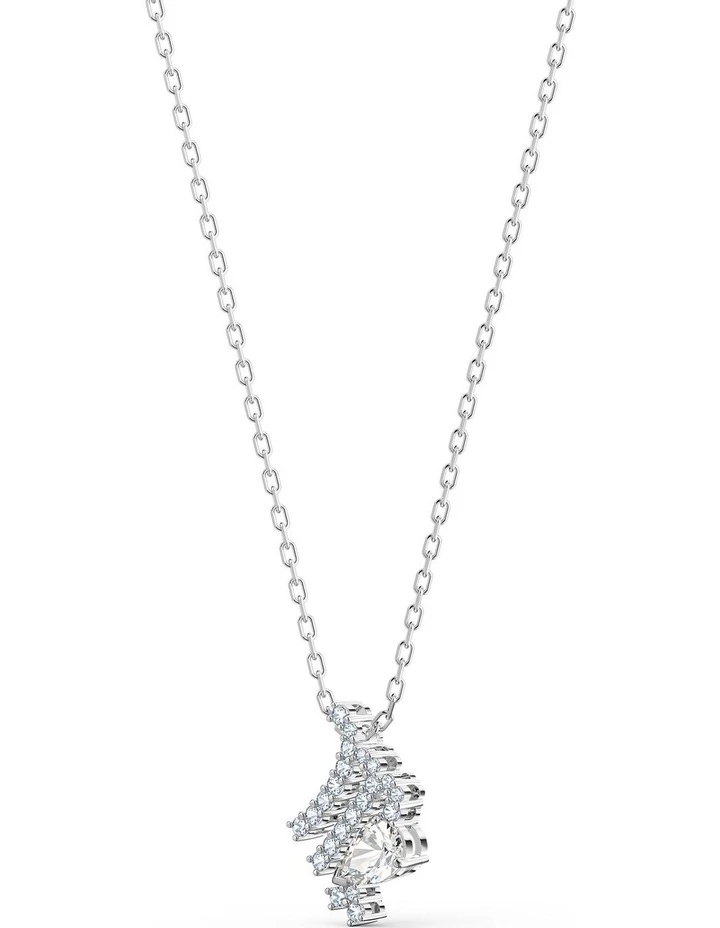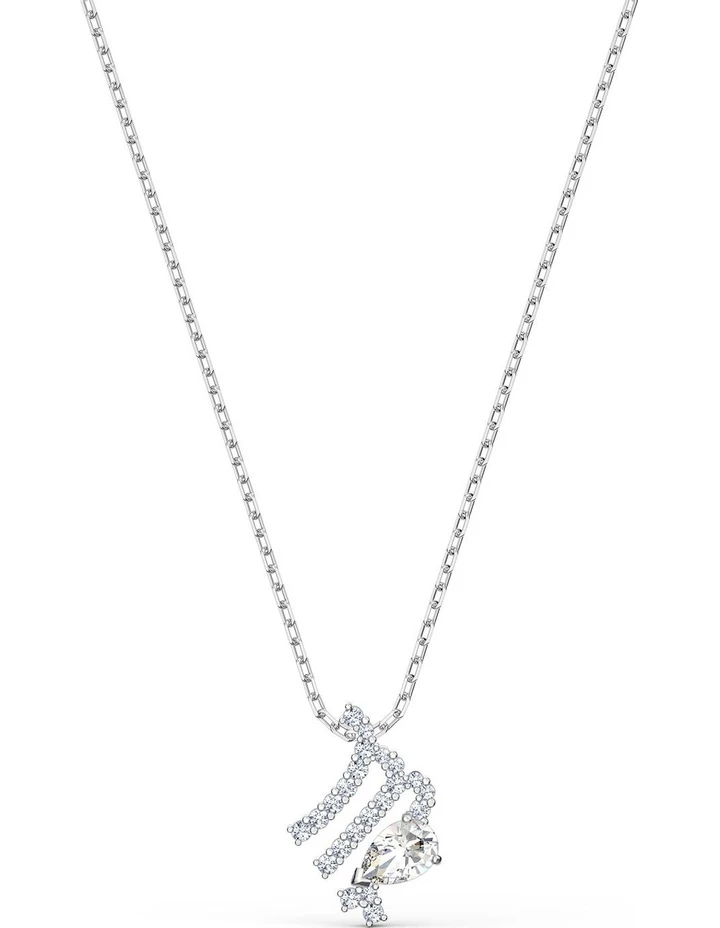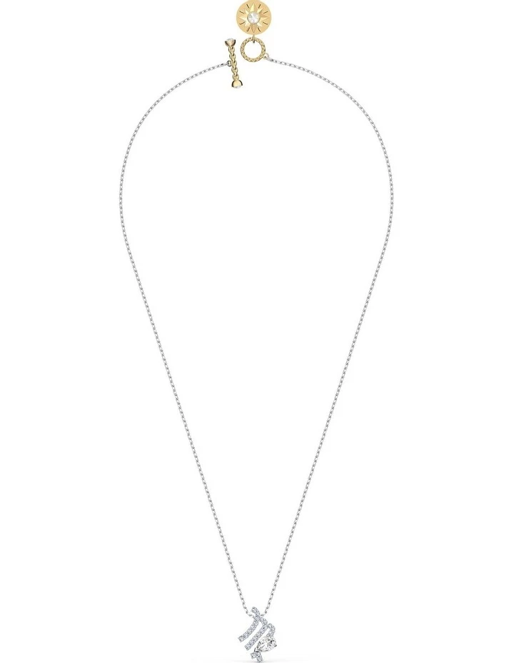 This pendant by Swarovski is inspired by the sign of Virgo. Representing hard work and an analytical mind, it traces the sign’s symbol in sparkling clear crystal pavé centered around a white stone, evoking the stars of the zodiac. The complementary chain is fastened with a t-bar closure that is adorned by a shimmering coin displaying a sun on one side, with elemental symbols on the flip side. Wear the closure at the back or the front, either with the zodiac motif or without it to create many different looks: ideal to personalize your style, especially when layered with matching pieces of jewelry. A perfect gift for those born under Virgo.