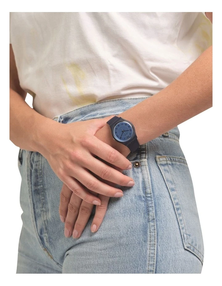 Pure design, with bio-sourced materials in the solid matte dark blue case, strap, loop & buckle and a stunning blue sun-brushed dial.