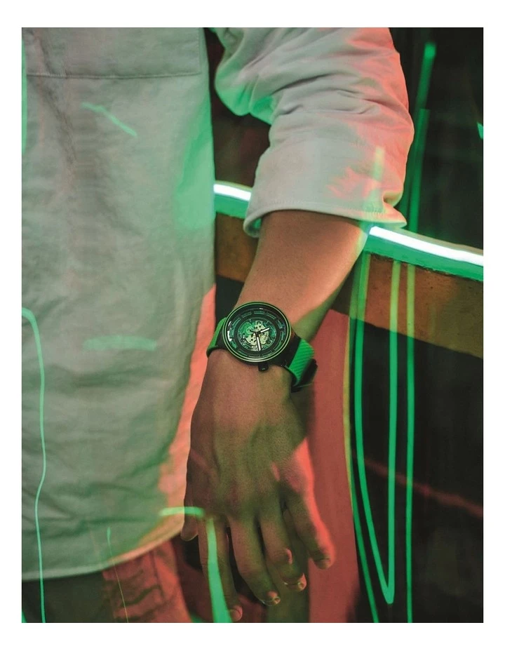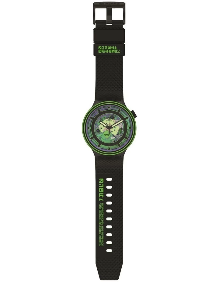 This futuristic watch features a silicone bicompression strap in green and black – and an additional strap in its special packaging to vary the style. The transparent dial with its multicolored print gives space for the dial and hands to shine with Swatch Glow. The special green Alien face feature in its unique placing replaces the standard driving wheel