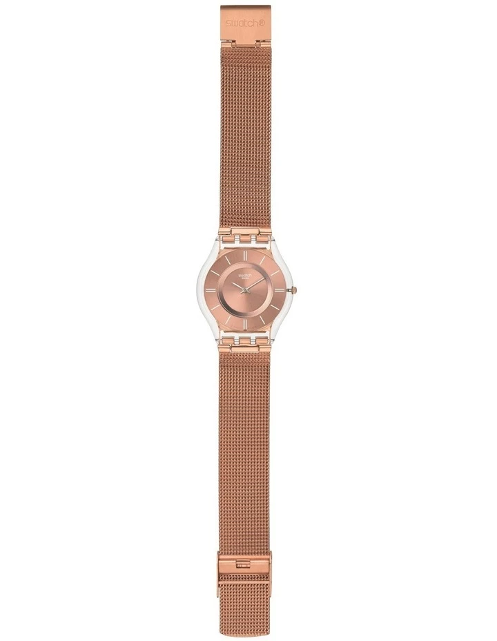 Swiss made, the Swatch watch HELLO DARLING (SFP115M) features a quartz movement, a stainless steel (milanese) strap and a plastic watch head.