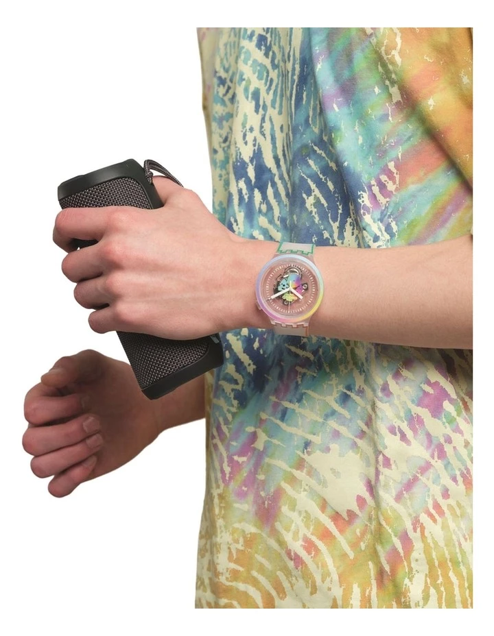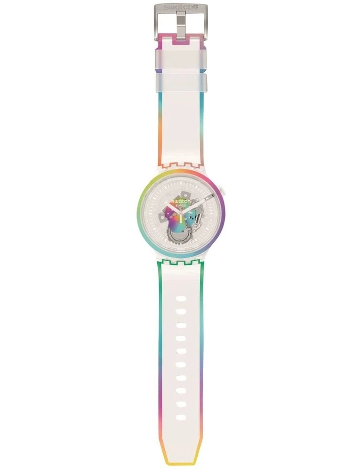 Time to celebrate with Pride. A semi-transparent matte white strap and bright and bold rainbow print make this the perfect statement. Be PROUD!