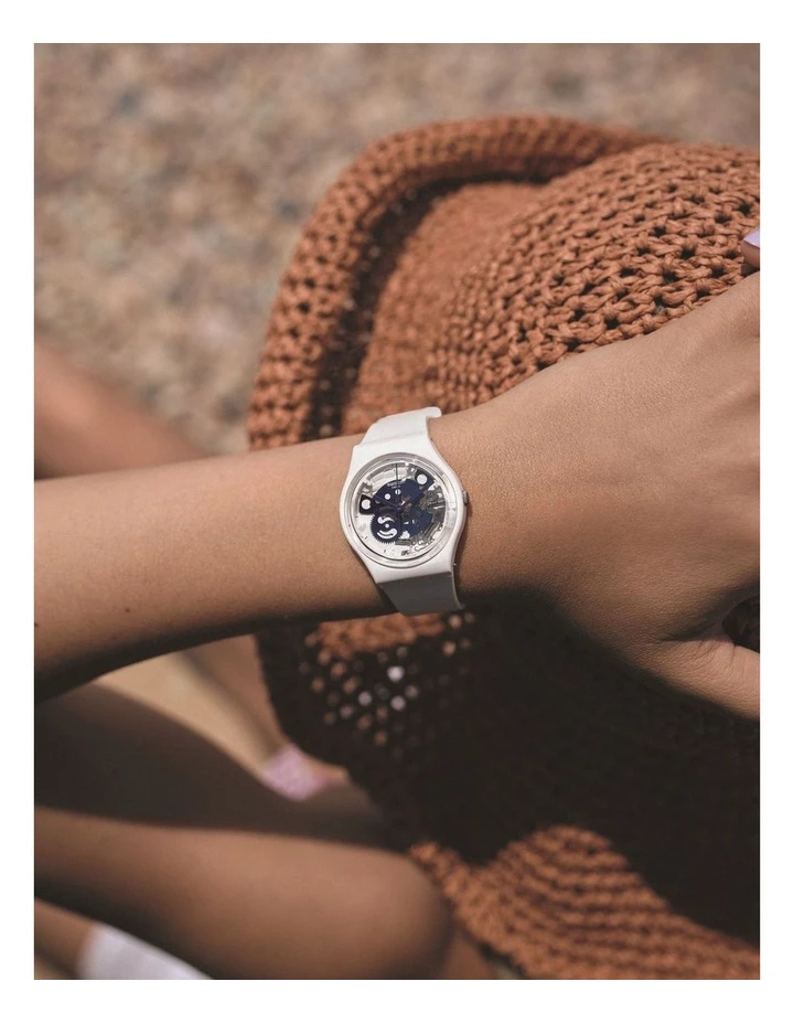 Crafted from bio-sourced materials and featuring a solid matte white strap, loop and buckle, with clear blue print and blue movement elements.
