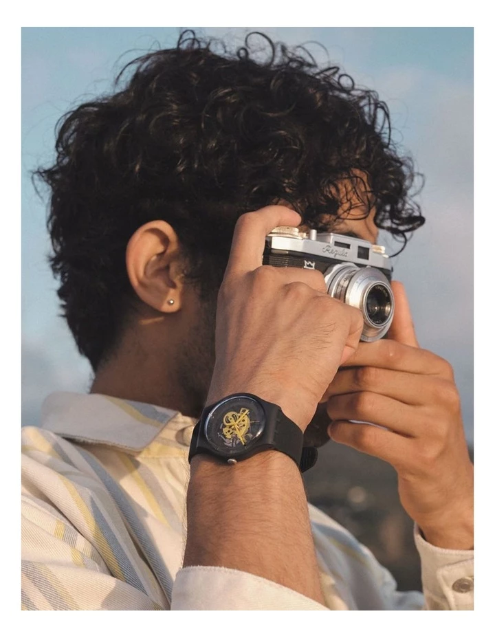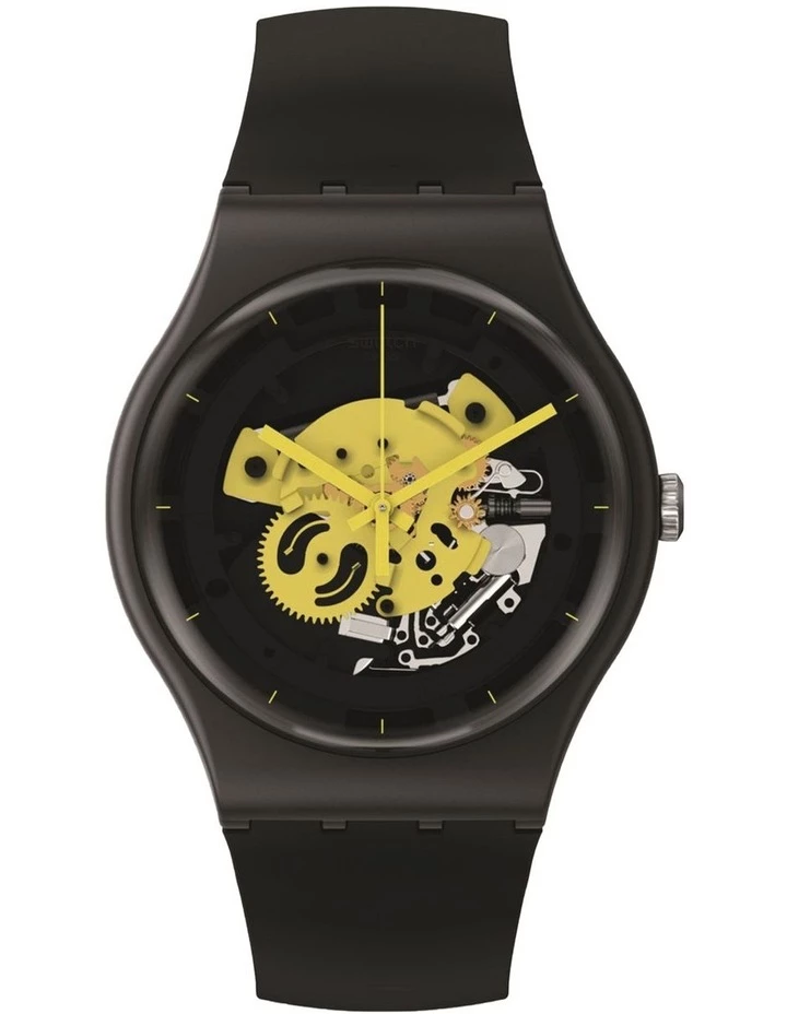 A special addition to the BIOCERAMIC styles. Crafted from bio-sourced materials, featuring a solid matte black strap and loop, with yellow print and yellow movement elements.