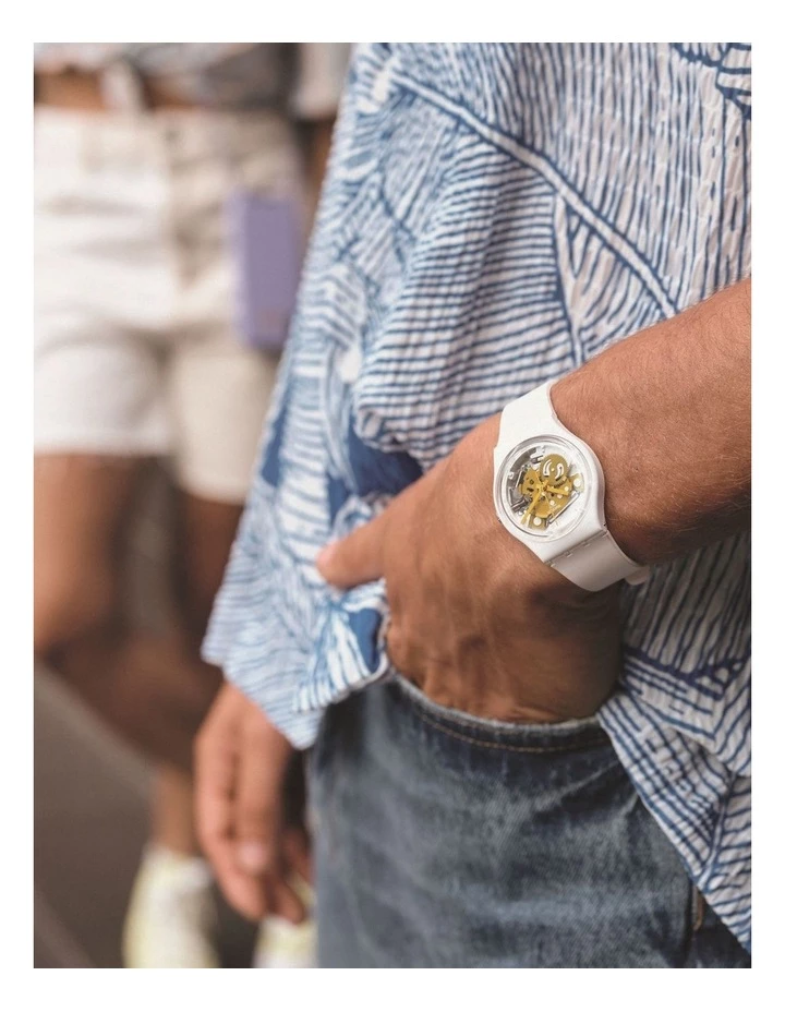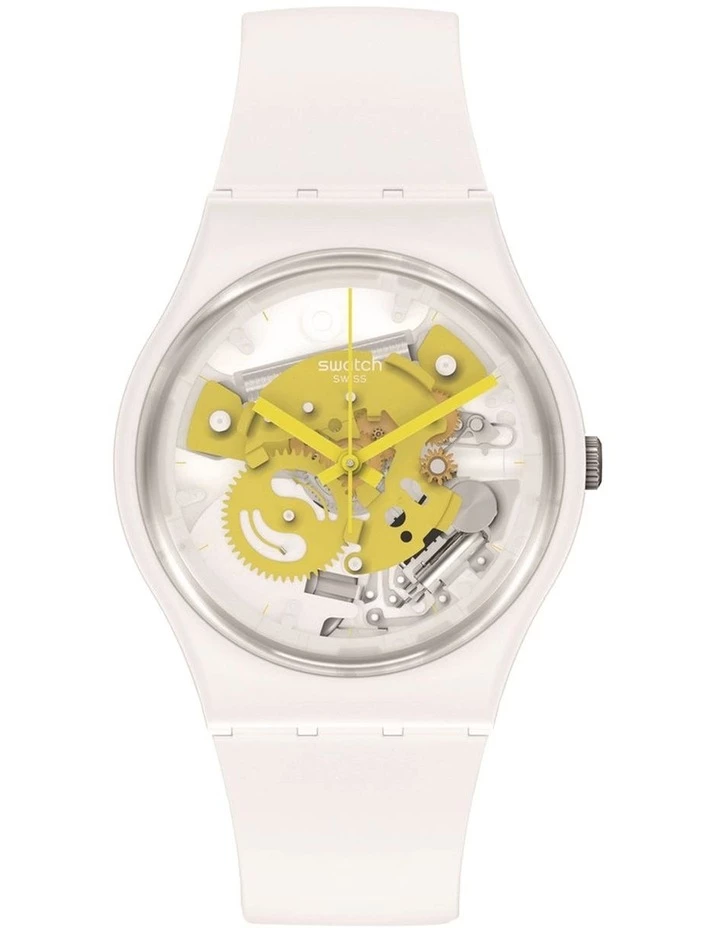 Crafted from bio-sourced materials and featuring a solid matte white strap, loop and buckle, with clear yellow print and yellow movement elements.