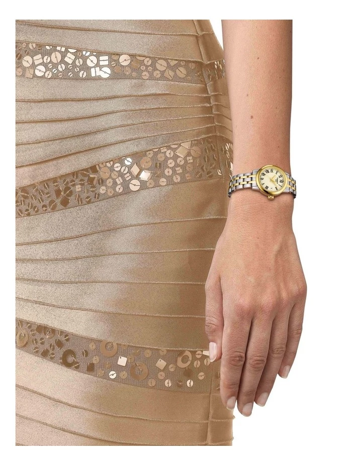 This womens quartz watch has scratch-resistant sapphire crystal, an ivory dial with Roman numerals and a stainless steel bi-colour bracelet.