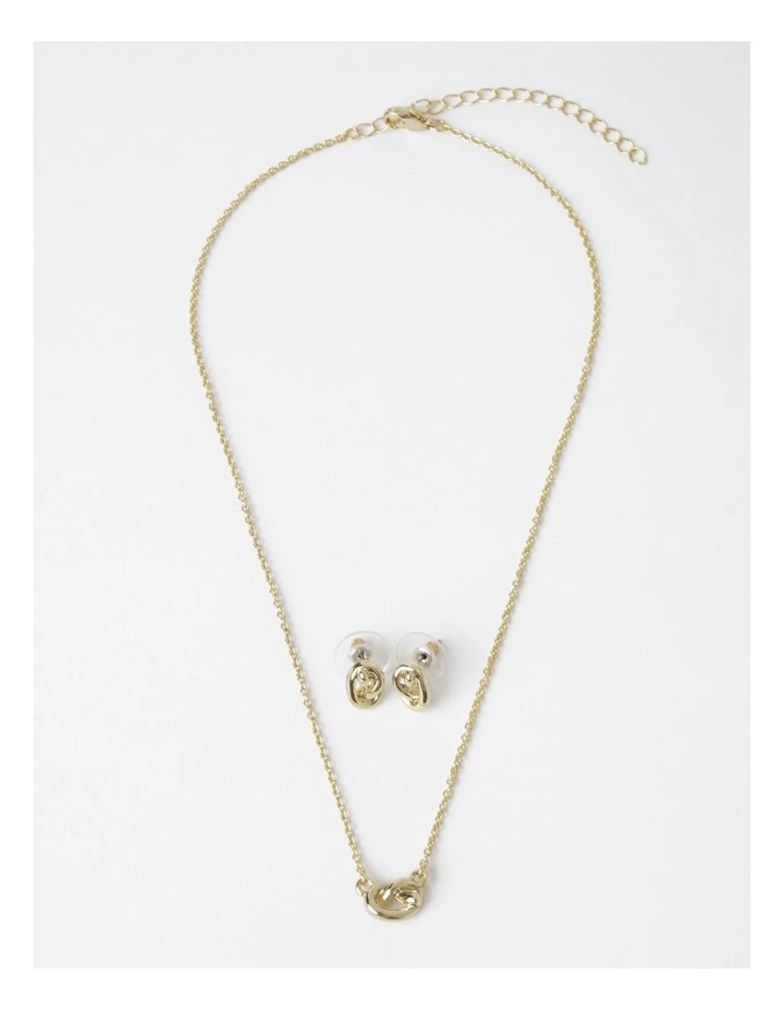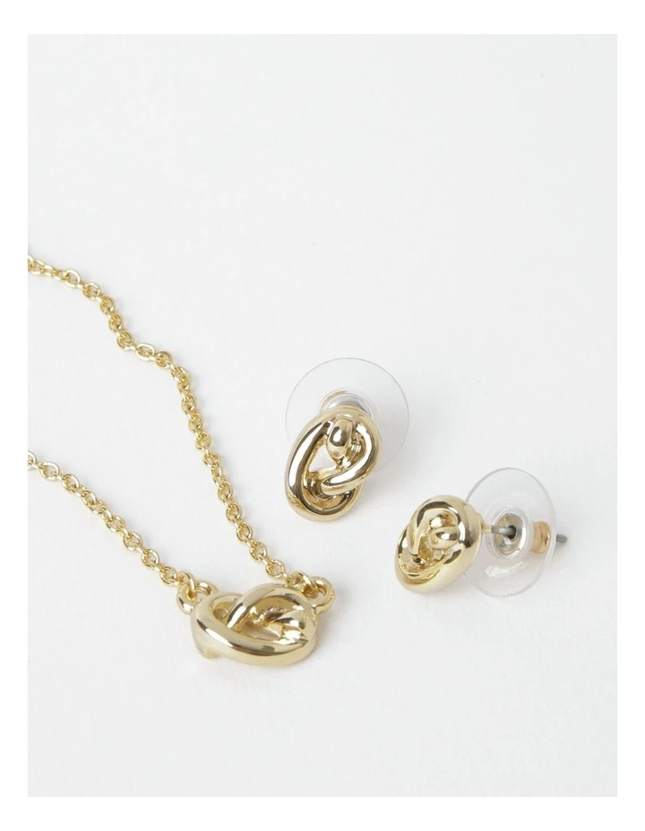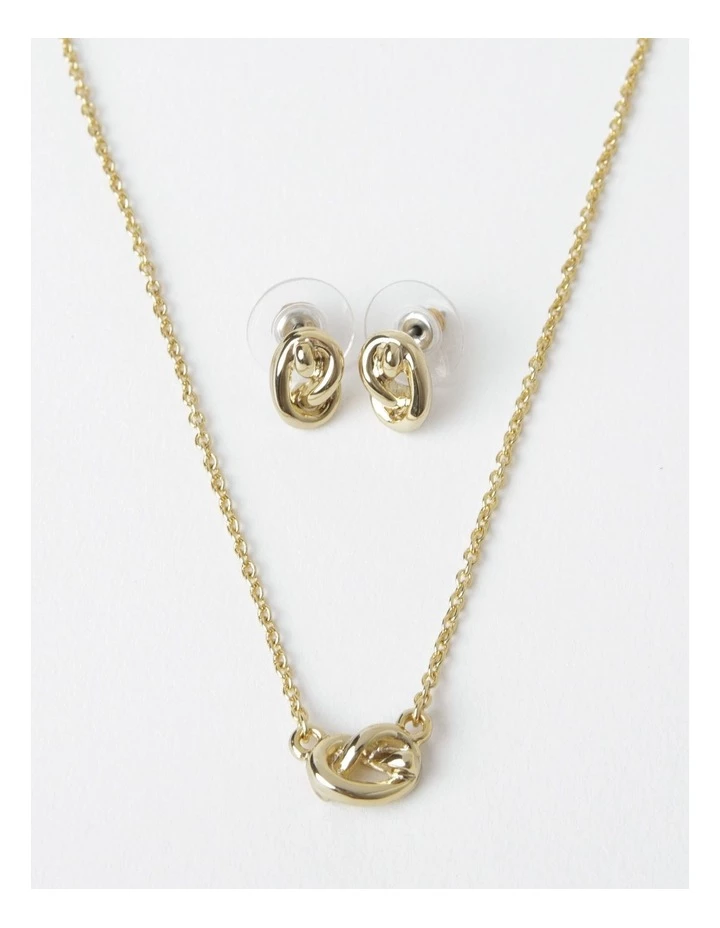Create the perfect look with a knot charm set. This set includes a thin, gold-toned necklace adorned with a knot charm, alongside a pair of knot charm studs. Wear them together, or separately for a chic look.