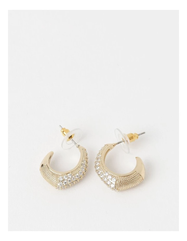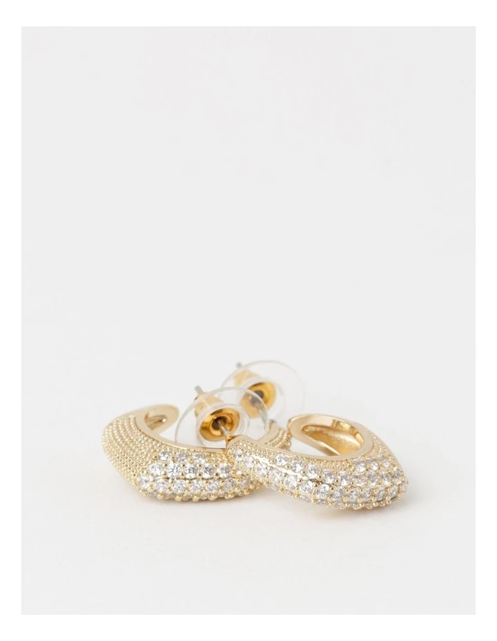 Leave a lasting impression with a pair of fashion forward earrings. These huggie earrings have a gold toned body, and are decorated with eye catching stones in a pave setting. Pair with your favourite gold jewellery for maximum impact.