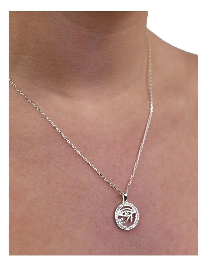 Adjustable belcher chain necklace with Eye of Horus charm with cubic zirconia bezel. The Eye of Horus is an ancient Egyptian symbol of health, protection & restoration.