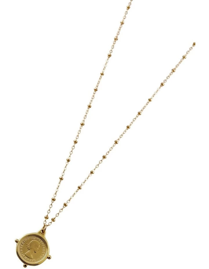 The Rosario chain is a rosary bead inspired chain. The beaded detail along its length brings more attention to this delicate necklace, which includes an authentic Australian threepence. The coin is encased in a yellow gold plated compass style frame.
